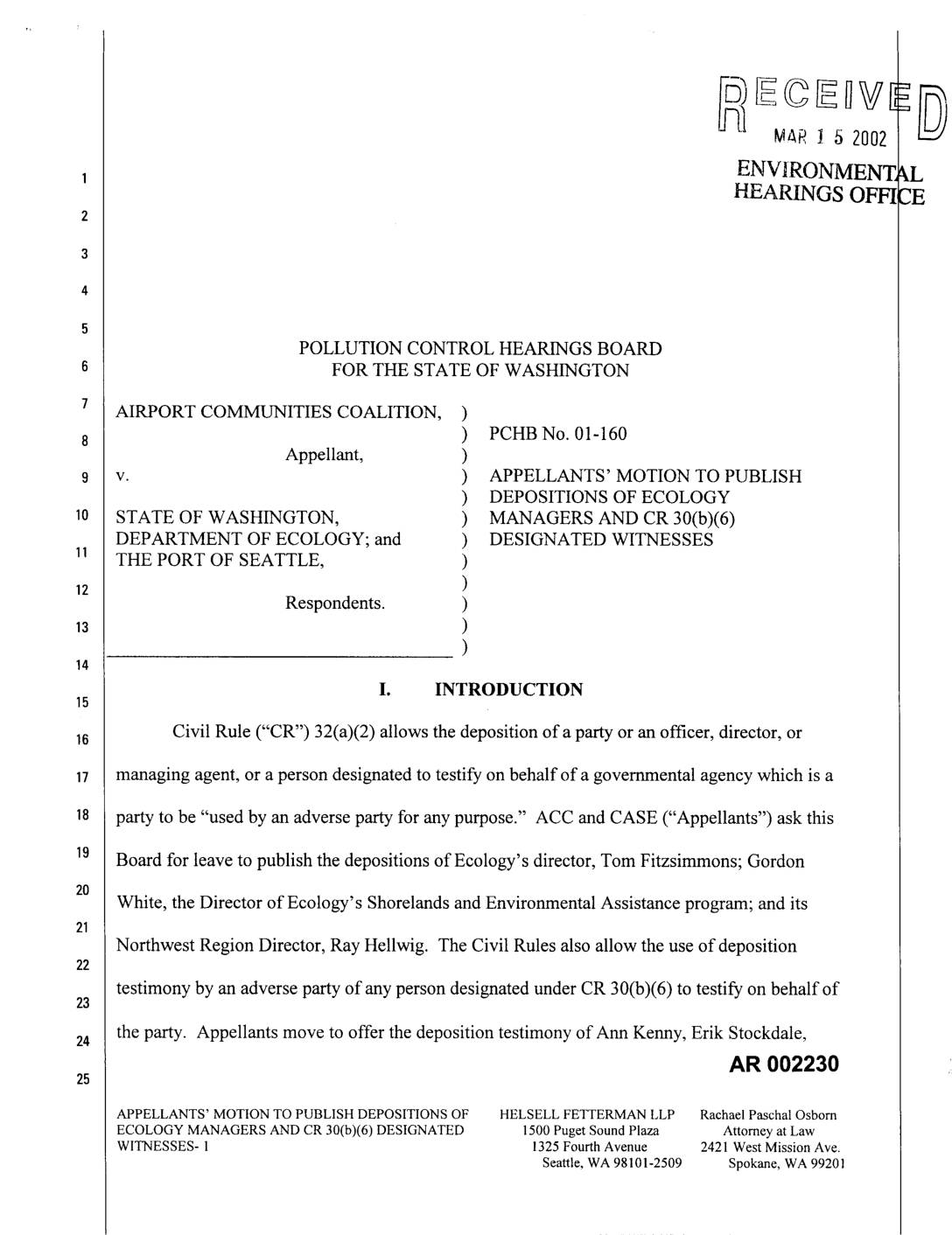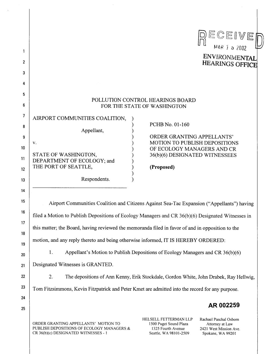 STATE OF WASHINGTON, ) 36(b)(6) DESIGNATED WITNESSEES DEPARTMENT OF ECOLOGY; and ) THE PORT OF SEATTLE, ) (Proposed) ) Respondents. ) Airport Communities Coalition and Citizens Against Sea-Tac Expansion ("Appellants") having filed a Motion to Publish Depositions of Ecology Managers and CR 36(b)(6) Designated Witnesses in this matter; the Board, having reviewed the memoranda filed in favor of and in opposition to the motion, and any reply thereto and being otherwise informed, IT IS HEREBY ORDERED: 1. Appellant's Motion to Publish Depositions of Ecology Managers and CR 36(b)(6)20 Designated Witnesses is GRANTED. 2. The depositions of Ann Kenny, Erik Stockdale, Gordon White, John Drabek, Ray Hellwig, Tom Fitzsimmons, Kevin Fitzpatrick and Peter Kmet are admitted into the record for any purpose. 2s AR 002259 HELSELLFETTERMANLLP RachaelPaschalOsborn ORDERGRANTINGAPPELLANTS' MOTIONTO 1500PugetSoundPlaza Attorneyat Law PUBLISHDEPOSITIONSOFECOLOGYMANAGERS& 1325FourthAvenue 2421WestMissionAve. CR36(b)(c)DESIGNATEDWITNESSES- 1 Seattle,WA98101-2509 Spokane,WA99201 SO ORDERED this day of ,2002. POLLUTION CONTROL HEARINGS BOARD KALEEN COTTINGHAM, Presiding ROBERT V. JENSEN, Member WILLIAM LYNCH, Member Presented by: " Peter J. Eglick, WSBA No. 8809 Kevin L. Stock, WSBA No. 14541 Michael P. Witek, WSBA No 2659_ . . R_cl_aelPaschalOsborn,WSBA Neo.21618 Attorneys for Airport Communities Coalition AR 002260 HELSELLFETTERMANLLP RachaelPaschalOsborn ORDERGRANTINGAPPELLANTS'MOTIONTO 1500PugetSoundPlaza AttorneyatLaw PUBLISHDEPOSITIONSOFECOLOGYMANAGERS& 1325FourthAvenue 2421WestMissionAve. CR 36(b)(c)DESIGNATEDWITNESSES- 2 Seattle,WA98101-2509 Spokane,WA99201 Approved as to Form; Notice of Presentation Waived: PORT OF SEATTLE Linda J. Strout, General Counsel, WSBA No. 9422 Traci M. Goodwin, Senior Port Counsel, WSBA No. 14974 FOSTER PEPPER & SHEFELMAN PLLC Roger A. Pearce, WSBA No. 21113 Steven G. Jones, WSBA No. 19334 BROWN REAVIS… -