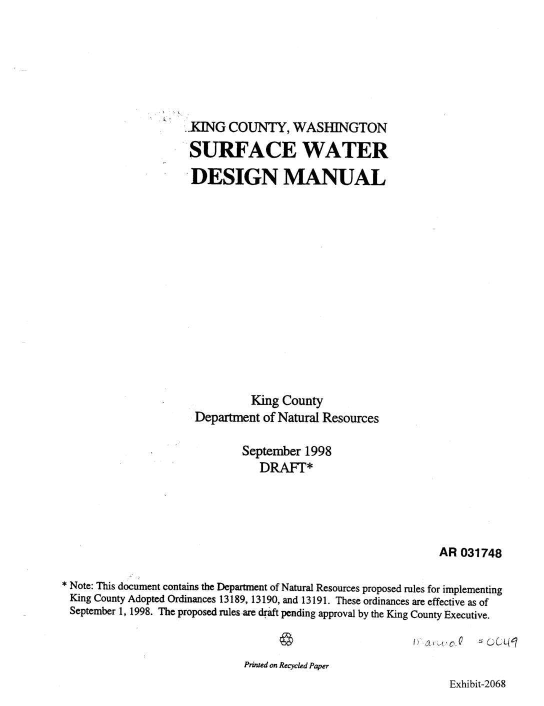 * Note: This document contains the Department of Naturai Resources proposed rules for implementing King County Adopted Ordinances 13189, 13190, and 13191. These ordinances are effective as of _ September 1, 1998. The proposed rules are &aft pending approval by the King County Executive. Printed on Recycled Paper Exhibit-2068 KING COUNTY, WASHINGTON SURFACE WATER DESIGN MANUAL King County Department of Natural Resources September 1998 Printedon Recycled Paper AR 031749 King County Executive Consultants Ron Sims Rick Schaefer, P.E., formerly RW Beck & Associates Malcom Leytham, PhD, P.E., Northwest Hydraulic Metropolitan King County Council Consultants Maggi Fimia, District 1 Gary Minton, PhD, P.E. Cynthia Sullivan, District 2 Carlos Herrera, P.E., Herrem Environmental Consultants Louise Miller, District 3 Beth Schmoyer, P.E., formerly Herrera Environmental Larry Phillips, District 4 Mark Ewbank, P.E., Herrera Environmental Consultants Dwight Pelz, District 5 Mike Giseburt, P.E., R.W. Beck & Associates Rob McKenna, District 6 Sarah Spear Cooke, Ph.D., Cooke Scientific Services Pete von Reiehbauer, District 7 SvR Design Company Greg Nickels, District 8 Kent Pullen, District 9 Department of Development and Environmential Larry Gossett, District 10 Services (DDES) Jane Hague, District 11 Robert Derrick, Director Brian Derdowski, District 12 Greg Kipp, Deputy Director Chris Vance, District 13 Contributing Staff (DDES) Department of Natural Resources (DNR) Joe Miles, P.E., Supervising Engineer Pam Bissonette, Director Jeff O'Neill, P.E., Supervising Engineer Kurt Triplett, Deputy Director Ann Bethel, Engineer Jim Kramer, Former Deputy Director Richard Lowe, P.E., Senior Engineer Jeff Stern, Program Analyst Water and Land Resources Division (WLRD) Nancy Hansen,… -