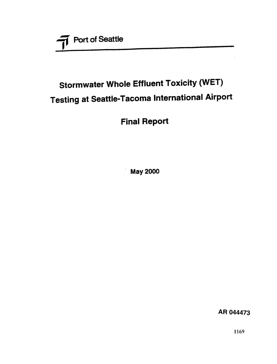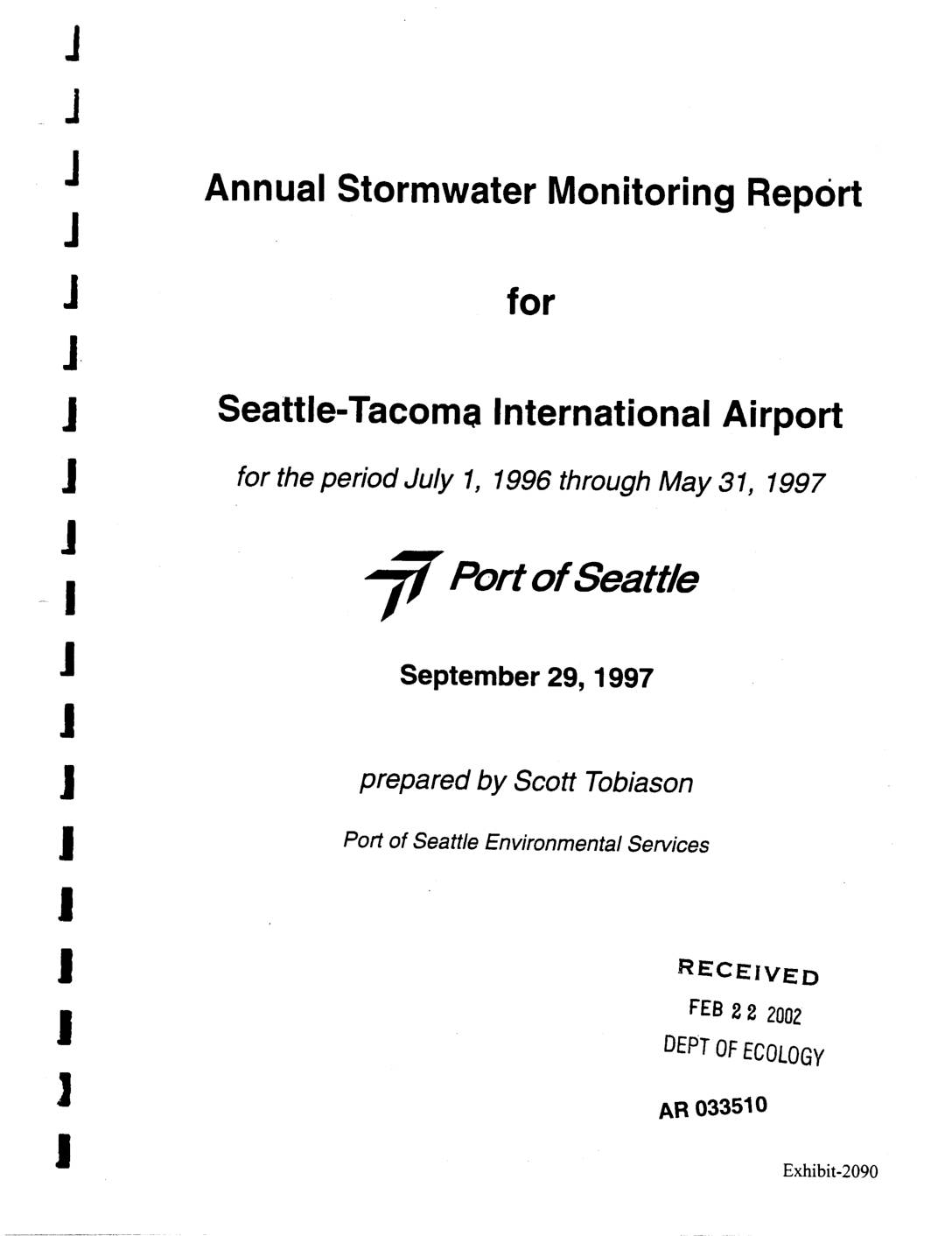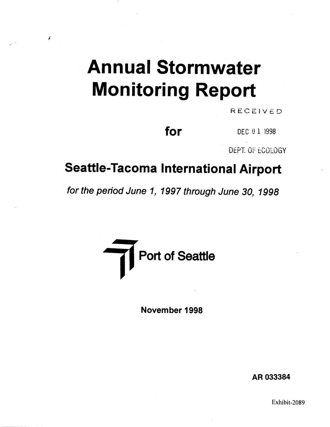 for the period July 1, 1996 through May 31, 1997 ] Port of Seattle -I I" September 29, 1997 | prepared by Scott Tobiason Port of Seattle Environmental Services RECEIVED FEB 88 2OOZ DEPTOFECOLOGY AFt033510 Exhibit-2090 J Introduction ,1 This report is submitted to the Washington Department of Ecology (WDOE)n j_ pursuant to Special Condition S.9 of the NPDES permit. This report collects and analyzes stormwater data collected in the past 4 quarters. Water quality data J from STIA's stormwater discharges is compared to relevant regional and national data on both a concentrationand unit load basis. Because many capital BMPs J were institutedduring the current data collection period, improvements in water quality will be discussed in more detail in the next annual report. j J Figure 1 shows the individualstormwater drainage basins and the STIA n Stormwater Management Boundary. Note that only colored subbasins drain to theB J storm system, white or blank areas near the terminals and gates drain to the Industrial Waste System (IWS) which drains runoff to the IndustrialWaste pl. Treatment Plant (IWTP). Monitoringdata from the IW'I'P are not included in this -_ report. J Sources of Reported Data J Data reported and analyzed in this annual report are limitedto discharges from stormwater ouffalls only and include: J • Quarterly and annual monitoring required by the NPDES permit; • Sampling specified by the Stipulated Agreement (Brasher, et. al., 1995);I! j • Stormwater Receiving Environment Study (SRES, Condition S.8 of theSTIA NPDES permit), and J runway deicing study… -