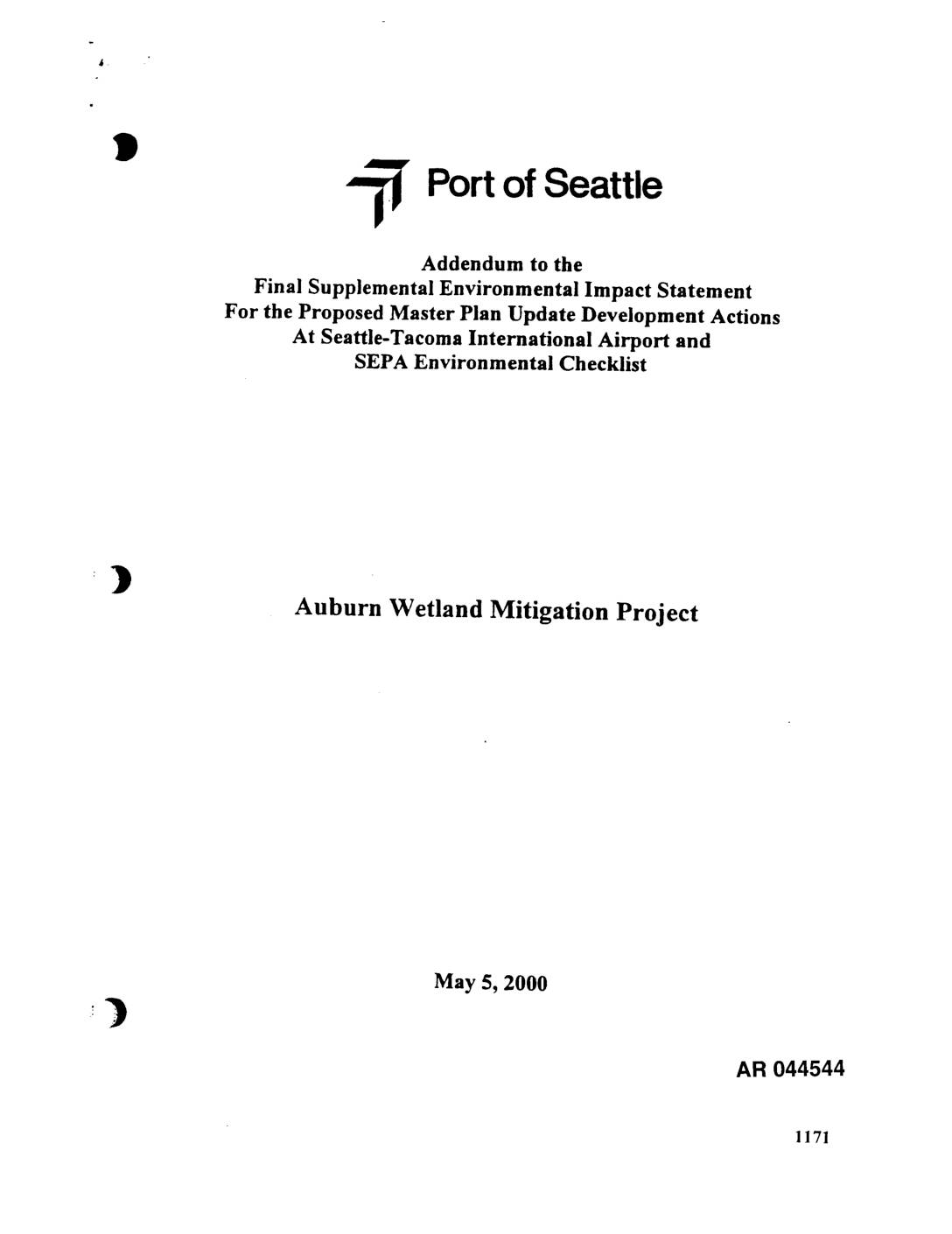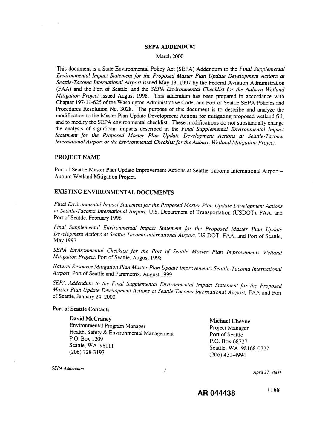 For the Proposed Master Plan Update Development Actions At Seattle-Tacoma International Airport and SEPA Environmental Checklist Auburn Wetland Mitigation Project May 5, 2000 AR 044544 1171 ,m Addendum to the Final Supplemental Environmental Impact Statement For the Proposed Master Plan Update Development Actions And SEPA Environmental Checklist for the Auburn Wetland Mitigation Project This document is a State Environmental Policy Act (SEPA) Addendum to the Final Supplemental Environmental Impact Statement for the Proposed Master Plan Update Development Actions at Seattle-Tacoma International Airport issued May 13, 1997 by the Federal Aviation Adminisffation (FAA) and the Port of Seattle, and the SEPA Environmental Checklist for the Auburn Wetland Mitigation Project issued August 1998. This addendum has been prepared in accordance with Chapter 197-11-625 of the Washington Administrative Code, and Port of Seattle SEPA Policies and Procedures Resolution No. 3028. The purpose of this document is to describe and analyze the modification to the Master Plan Update Development Actions for mitigating proposed wetland fill, and to modify the SEPA environmental checklist. These modifications do not substantially change the analysis of significant impacts described in the Final Supplemental Environmental Impact Statement for the Proposed Master Plan Update Development Actions at Seattle-Tacoma International Airport or the Environmental Checklist for the Auburn Wetland Mitigation Project. PROJECT NAME Port of Seattle Master Plan Update Improvement Actions at Seattle-Tacoma International Airport - Auburn Wetland Mitigation Project (POS SEPA No. 00-07) EXISTING ENVIRONMENTAL DOCUMENTS Final Environmental lmpact Statement for the Proposed Master Plan Update Development Actions at Seattle-Tacoma International… -