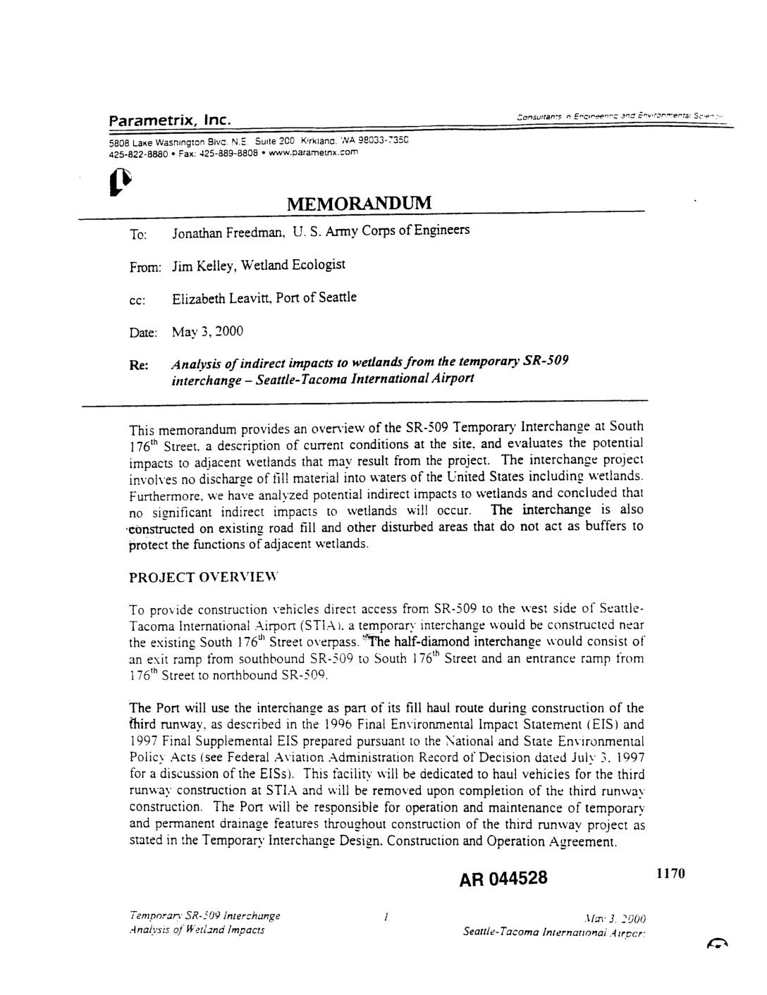 5808 LaKe Washington Btv_.. N.E Suite 200 Kirklana. WA 98033-7350 425-822-8880 * Fax: 425-889-8808 • www.paramemx.com P MEMORANDUM To: Jonathan Freedman, U. S. Army Corps of Engineers From: Jim Kelley, Wetland Ecologist cc: Elizabeth Leavitt, Port of Seattle Date: May 3, 2000 Re: Analysis of indirect impacts to wetlands from the temporary SR-5O9 interchange - Seattle- Tacoma International Airport This memorandum provides an overview of the SR-509 Temporary Interchange at South 176th Street, a description of current conditions at the site, and evaluates the potential impacts to adjacent wetlands that may result from the project. The interchange project involves no discharge of fill material into waters of the United States including wetlands. Furthermore, we have analyzed potential indirect impacts to wetlands and concluded that no significant indirect impacts to wetlands will occur. The interchange is also •constructed on existing road fill and other disturbed areas that do not act as buffers to protect the functions of adjacent wetlands. PROJECT OVERVIEW To provide construction vehicles direct access from SR-509 to the west side of Seattle- Tacoma International Airport (STIA 1.a temporary interchange would be constructed near the existing South 176d' Street overpass."Re hal'f-diamond interchange would consist of an exit ramp from southbound SR-509 to South 176th Street and an entrance ramp from 176 thStreet to northbound SR-50cL The Port will use the interchange as part of its fill haul route during construction of the /'bird runway, as described in the 1996 Final Environmental Impact Statement (EIS) and 1997 Final Supplemental EIS… -
