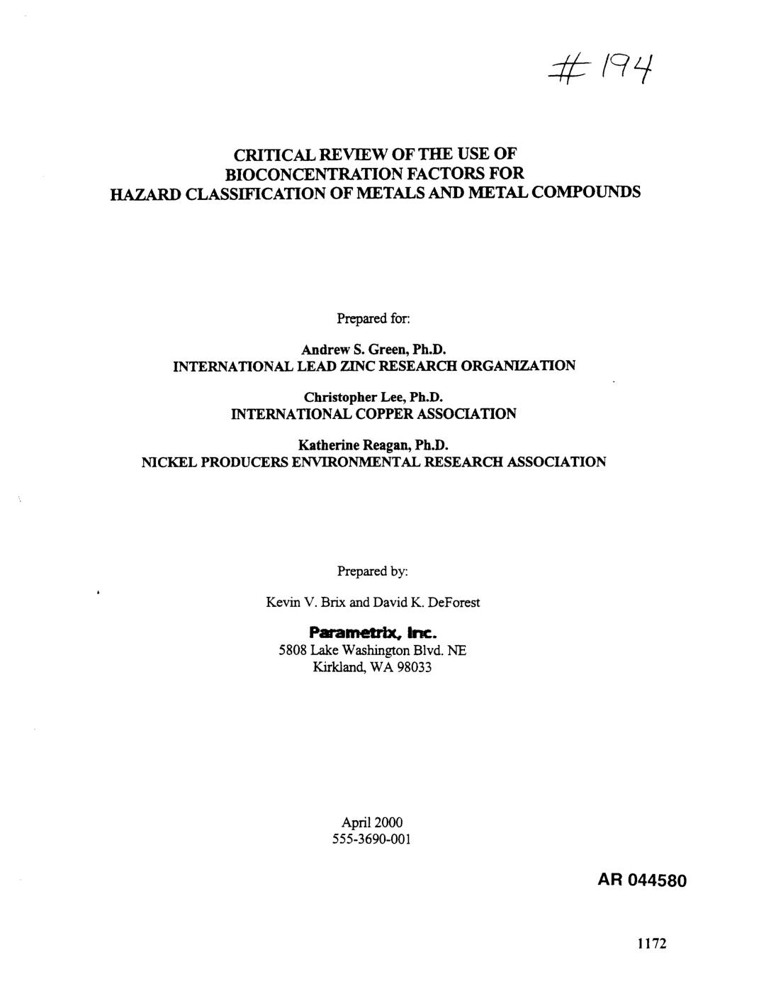 Kevin V. Brix and David K. DeForest P_ram_rix, Inc. 5808 Lake Washington Blvd. NE K.irkland, WA 98033 April 2000 555-3690-001 AR 044580 1172 TABLE OF CONTENTS Page EXECUTIVE S_Y .................................................................................................................. iv 1. INTRODUCTION ..................................................................................................................... 1 2. REVIEW OF METAL BIOACCUMLKATION ..................................................................... 3 2.1 METAL ESSENTIALITY ........................................................................................... 3 2.2 HOMEOSTATIC CONTROL OF METALS .............................................................. 4 2.2.1 Cadmium .......................................................................................................... 6 2.2.2 Copper .............................................................................................................. 7 2.2.3 Lead .................................................................................................................. 8 2.2.4 Nickel ................................................................................................................ 8 2.2.5 Silver ................................................................................................................. 8 2.2.6 Zinc ................................................................................................................... 9 2.2.7 Summary ......................................................................................................... 10 2.3 RELATIONSHIP BETWEEN WATER CONCENTRATIONS AND BCFS ......... 10 3.3.1 Metal-Specific Examples ............................................................................... 11 2.3.2 Interpretation .................................................................................................. 24 2.4 BIOACCUMUIATION AS AN INDICATOR OF CHRONIC TOXICITY FOR METALS AND METAL COMPOUNDS ........................................................ 29 2.4.1 Relationships Between BCFs and Chronic Toxicity ..................................... 30 2.4.2 Species Sensitivity Distributions .................................................................... 32 2.5 SECONDARY POISONING AND BIOMAGNIFICATION OF METALS AND METAL COMPOUNDS .................................................................................. 45 2.5.1 Metals and Inorganic Metallic Compounds ................................................... 47 2.5.2 Organomctallic Compounds .......................................................................... 52 2.5.3 Conclusions on Secondary Poisoning ............................................................ 53 3. CONCLUSIONS ..................................................................................................................... 54 J 4. REF]_--eR]_NCE S ........................................................................................................................ 56 APPENDICES A DATABASE OF BIOCONCENTRATION FACTORS (BCFs) Critical Review of the Use of ii April 2000 Bioaccumulation Potential for Hazard 555-3690-001 (01) Classification of Metals and Metal Compounds i_tmczaAro_i_voLioarA_J • - _.m t,_ zooo>._.¢ AR 044581 LIST OF FIGURES Figure Page Metal BCFs for Algae and Diatoms ........................................................................................ 12 Cadmium BCFs for Fish ......................................................................................................... 14 Cadmium BCFs for Non-Bivalve Invertebrates ..................................................................... 15 Cadmium BCFs for Bivalves .................................................................................................. 16 Copper BCFs for Non-Bivalve Invertebrates ......................................................................... 18 Copper BCFs for… -