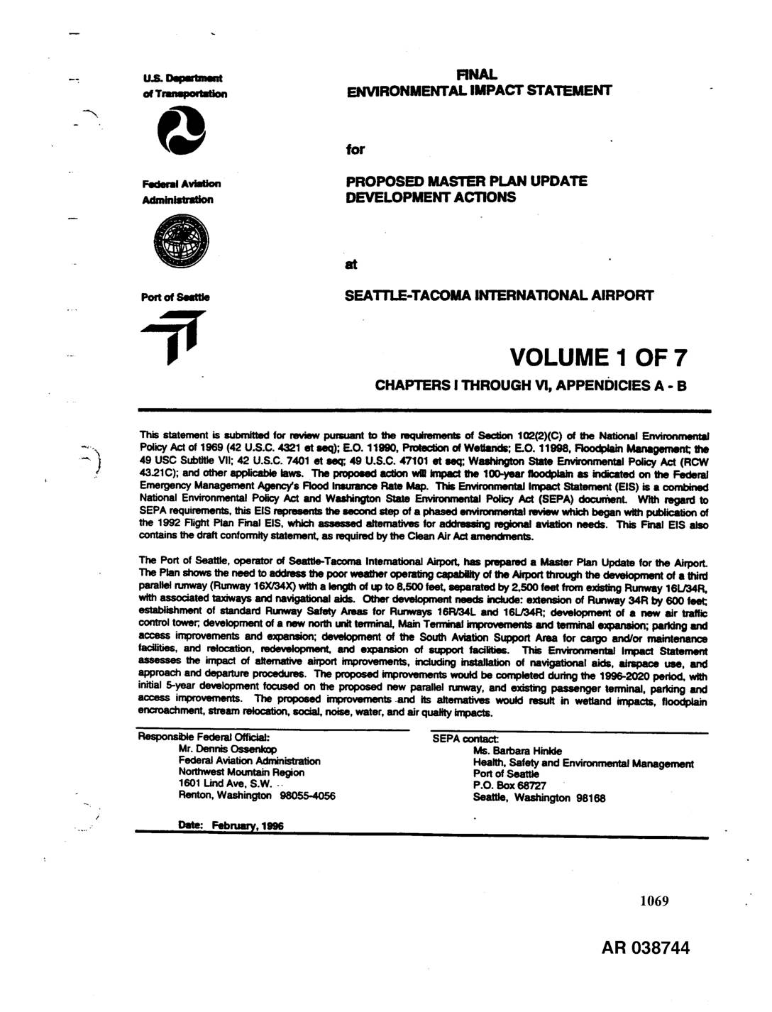 CHAFTERS I THROUGH Vl, APPENDICES A - B This statement is subndtted for review pursuant to the mqulmments of _,S,___'_,_n.102(2)(C) of the National Environmental -_. PolicyAct of 1969 (42 U.S.C. 4321 et uo.); E.O. 11990, _ of Wetlands; E.O. 11998, Roodplain Management; _ 49 USC Subtile VII; 42 U.S.C. 7401 et Se¢l;,49 U.S.C. 47101 st BKI; WuNngton State EnvironmentalPolicy Act (RCW 1,. 43.21C); and otherapfl_cable laws. The propmmdacbon will knpact the 100-year ltoodplaJnas _ted on the Federal EmergencyManagementAgency's Flood Insurance Rate Map. This EnvironmentalImpact Statement (EIS) is a combined National EnvironmentalPolicyAct and Washington State EnvironmentalPolicy Act (SEPA) docurnenL With regard to SEPA requirements,this EIS representsthesecondstep of a phased onvi_l reviewwhich began withpublicationof the 1992 Right Plan Final EIS, which assessed alternativesfor a_ regional aviation needs. This Final EIS also containsthe draftconformitystatement,as requiredby the Clean AirActamendments. The Port of Seattle, operator of Seatl_-Tacoma InternationalAirport,has prepared a Master Plan Update for the AirporL The Plan showsthe naed to address the poorweather operalJngcapeddlityof ihe Akport _ _ _ _ a _ parallelrunway(Runway 16X/34X) witha kmglh of up to 8,500 feet, mrated by 2,500 feet from e;-_t_g Rurmmy16L/34R, wi_ associatedtaxiwaysand navigatk)nalaids. Other developmentneeds include:extension of Runway 34R by 600 feet; establishmentof standard Runway Safety Areas for Runways 16R/34L and 16L/34R; development of a new air traffic controltower;,developmentof a new norDtunitterminal, MainTerminal intprovenlentsand tenninal expanldon;parkingand access improvementsand expansion; dove_ of the Soulh Aviation Support Area for cargo and/or maintenance facilities, and relocation, redevelopment,and expansion of support facies. This Environmental Impact Statement assesses the impact of… -