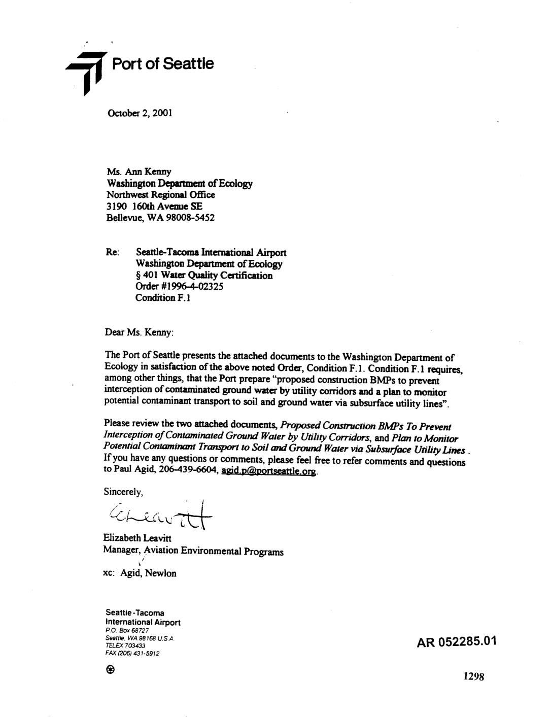 The Port of Seattle presents the attached documents to the Washington Department of Ecology in satisfaction of the above noted Order, Condition F. 1. Condition F. 1 requires, among other things, that the Port prepare "proposed construction BMPs to prevent interception of contaminated ground water by utility corridors and a plan to monitor potential contaminant transport to soil and ground water via subsurface utility lines". Please review the two attached documents, Proposed Construction BMPs To Prevent Interception of Contaminated Ground Water by Utility Corridors, and Plan to Monitor Potential Contamtncmt Tranxport to Soil and Ground Water via Subsurface Utility Lines. If you have any questions or comments, please feel free to refer comments and questions to Paul Agid, 206-439-6604, aod.DC_ortseattle.om. Sincerely, Elizabeth Leavitt Manager, .Aviation Environmental Programs / xc: Agid, Newion Seattle-Tacoma InternationalAirport p.O. Box 68727 s,,,,,,,wA a,68u.s.,,. AR 052285.01TELEX;'03433 FAX(206)431-5912 1298 Seattle Tacoma Intemational Airport _401 Water Quality Certification#1996-4-02325 ConditionF.1 ProposedConstructionBMPs To Prevent Interceptionof Contaminated GroundWater byutimyCorridors In accordance with the WashingtonState Departmentof Ecology(Ecology)Water Quality Certificationfor U.S. ArmyCorps of EngineersPublic Notice 1996-4-02325, Condition F. 1, the Portof Seattle (Port) submitsthis proposalfor Best Management Practices (BMPs) for prevention of migrationof contaminatedgroundwater via subsurfaceutily lines at the Seattle-Tacoma IntemationalAirport (STIA). A draft of this BMP proposalis due to Ecologyno later than September 30, 2001. Best Management Practicesfor preventionof migrationof contaminated groundwater by newly constructedutilitycorridorswill consist of. and will be implementedby modificationof standard utilityconstructiondesign guidelinesand specifications.The followingconstructiontechniques will be specifiedfor future constructionof subsurface utilitiesbelow paved areas inthe principal aviation operationsand maintenance area… -