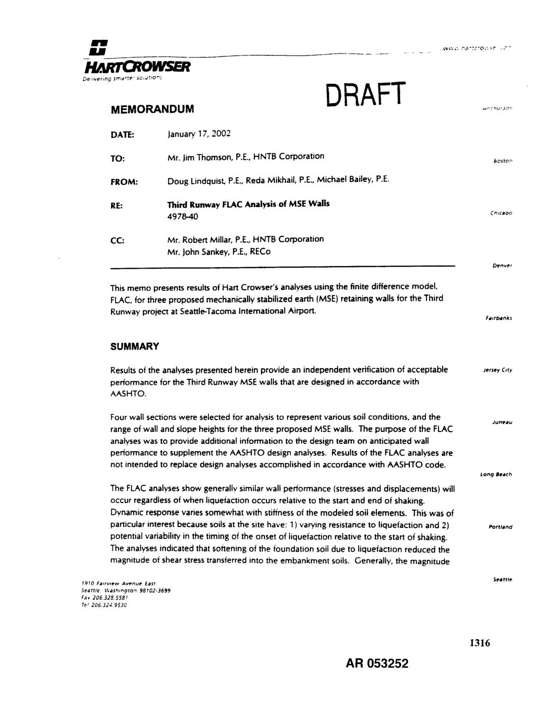 TO: Mr. Jim Thomson, P.E., HNTB Corporation 6o.o_ FROM: Doug Lindquist, P.E., Reda Mikhail, P.E., Michael Bailey, P.E. RE: Third Runway FLAC Analysis of MSE Walls 4978-40 Cn,caoo CC: Mr. Robert Millar, P.E., HNTB Corporation Mr. John Sankey, P.E., RECo Denver This memo presents results of Hart Crowser's analyses using the finite difference model, FLAC, for three proposed mechanically stabilized earth (MSE) retaining walls for the Third Runway project at Seattle-Tacoma International Airport. F_arD4nk$ SUMMARY Results of the analyses presented herein provide an independent verification of acceptable Je,,e_,c,ry performance for the Third Runway MSE walls that are designed in accordance with AASHTO. Four wall sections were selected for analysis to represent various soil conditions, and the Juneau range of wall and slope heights for the three proposed MSE walls. The purpose of the FLAC analyses was to provide additional information to the design team on anticipated wall performance to supplement the AASHTO design analyses. Results of the FLAC analyses are not intended to replace design analyses accomplished in accordance with AASHTO code. Long Beach The FLAC analyses show generally similar wall performance (stresses and displacements) will occur regardless of when liqueiaction occurs relative to the start and end of shaking. Dynamic response varies somewhat with stiffness of the modeled soil elements. This was of particular interest because soils at the site have: 1) varying resistance to liquefaction and 2) portland potential variability in the timing of the onset of liquefaction relative to the start of shaking. The analyses indicated that…
