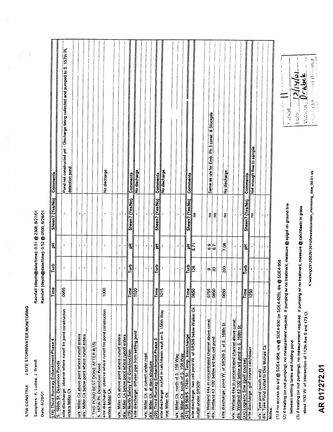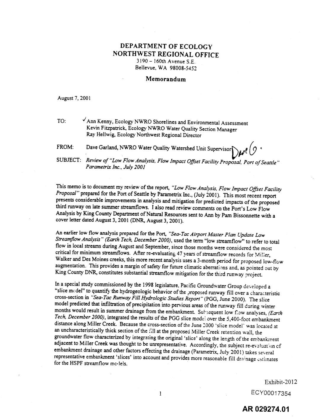 SUBJECT: Reviewof "Low FlowAnalysis, Flow Impact OffsetFacilityProposal, Port of Seattle" ParametrixInc., July 2001 This memo is to documentmy reviewof the report, "LowFlowAnalysis,Flow Impact Offset Facility Proposal" preparedfor the Port of Seattleby ParametrixInc., (July2001). This most recent report presentsconsiderableimprovementsin analysisand mitigationfor predictedimpactsof the proposed third runwayon latesummerstreamflows. I alsoread reviewcommentsonthe Port's Low Flow Analysisby KingCountyDepartmentof NaturalResourcessentto Ann by PareBissormette with a cover letter datedAugust3, 2001 (DNR,August3, 2001). An earlierlow flowanalysisprepared for the Port, "Sea-TacAirport Master Plan Update Low StreamflowAnalysis" (EarthTectt December2000), usedthe term"low streamflow"to refer to total flow in localstreamsduringAugustand September,since thosemonthswere considered the most criticalfor minimumstreamflows. ARerre-evaluating47 years ofstreamflow records for Mi'ler, Walker andDes Moinescreeks,this more recentanalysis usesa 3-monthperiod for proposed low-flow augmentation.This provides a marginof safety for futureclimaticaberrationsand, as pointed out by King CountyDNR,constitutessubstantialstreamflowmitigationfor the third runway project. In a special studycommissionedby the 1998 legislature,Pacific GroundwaterGroup de;eloped a "slice mc.del"to quantifythe hydrogeologicbehaviorof the proposedrunwayfill over a characteristic cross-sectionin "Sea-TacRunwayFill HydrologicStudiesReport" (PGG,June2000). The slice model predictedthat infiltrationof precipitationintoperviousareas&the runway fill duringwinter monthswould result in summerdrainagefromthe embankment. Sul';equentlow f_owanalyses, (Earth Tech,December2000), integratedthe results of the PGG slice modeiover the 5,400-footembankment distancealong MillerCreek. Becausethe cross-sectionoft.he June 2000 'slice model"was locatedat an uncharacteristicallythick sectionof the :_11at the proposedMiller Creekretention wall, the groundwaterflowcharacterizedby integratingthe original'slice' along the length of the embankznent adjacentto Miller Creek was thoughtto be unrepresentative.Accordingly,the subject re-ev_luat!_mcf embankmentdrainageandother factorseffectingthe drainage(Parametrix,July 2001) takes several representativeembankment'slices' intoaccount andprovidesmorereasonablefill drainage_stimates for the HSPFstreamflowmc-lels. Exhibit-2012 ECYO0017354 AR 029274.01 Non-Hydrologic Impacts Estimates of non-hydrologic impacts such as influence of importedwater district water,exercise of water rights andon-site… -