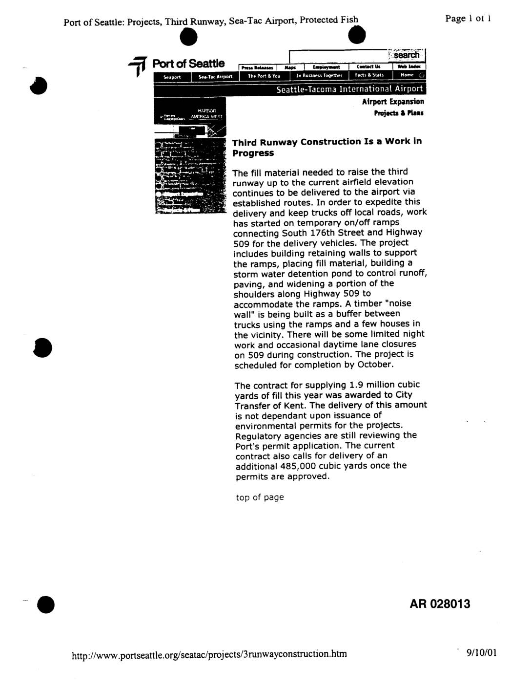 Port of Seattle: Projects, Third Runway, Sea-Tat Airport, Protected Fish Page 1 ot t Third Runway Construction ls a Work in Progress The fill material needed to raise the third runway up to the current airfield elevation continues to be delivered to the airport via established routes. In order to expedite this delivery and keep trucks off local roads, work has started on temporary on/off ramps connecting South 176th Street and Highway 509 for the delivery vehicles. The project includes building retaining walls to support the ramps, placing fill material, building a storm water detention pond to control runoff, paving, and widening a portion of the shoulders along Highway 509 to accommodate the ramps. A timber "noise wall" is being built as a buffer between trucks using the ramps and a few houses in the vicinity. There will be some limited night work and occasional daytime lane closures on 509 during construction. The project is scheduled for completion by October. The contract for supplying 1.9 million cubic yards of fill this year was awarded to City Transfer of Kent. The delivery of this amount is not dependant upon issuance of environmental permits for the projects. Regulatory agencies are still reviewing the Port's permit application. The current contract also calls for delivery of an additional 485,000 cubic yards once the permits are approved. top of page - AR 028013 http ://www.portseattle.org/seatac/projects/3runwayconstruction.htm 9/10/01 EXH0774028013 EXH0774028014 -