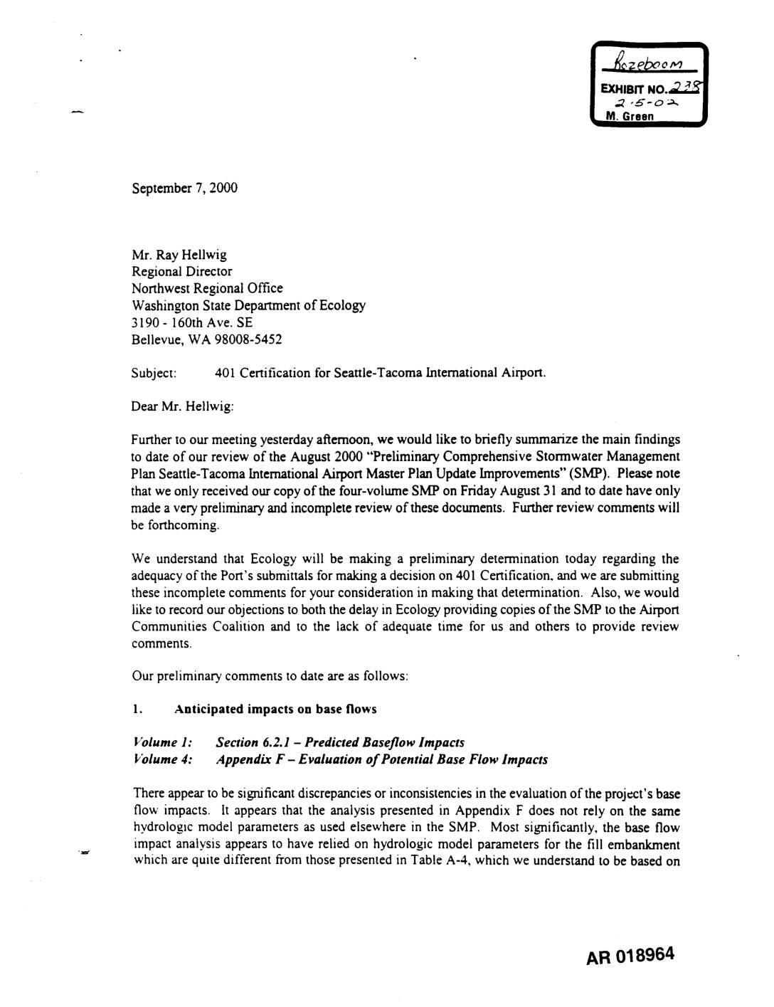 Subject: 401 Certification for Seattle-Tacoma International Airport. Dear Mr. Hellwig: Further to our meeting yesterday afternoon, we would like to briefly summarize the main findings to date of our review of the August 2000 "Preliminary Comprehensive Stormwater Management Plan Seattle-Tacoma International Airport Master Plan Update Improvements" (SMP). Please note that we only received our copy of the four-volume SMP on Friday August 31 and to date have only made a very preliminary and incomplete review of these documents. Further review comments will be forthcoming. We understand that Ecology will be making a preliminary determination today regarding the adequacy of the Port's submittals for making a decision on 401 Certification, and we are submitting these incomplete comments for your consideration in making that determination. Also, we would like to record our objections to both the delay in Ecology providing copies of the SMP to the Airport Communities Coalition and to the lack of adequate time for us and others to provide review comments. Our preliminary comments to date are as follows: 1. Anticipated impacts on base flows Volume 1: Section 6.2.1 - Predicted Baseflow Impacts Volume 4: Appendix F - Evaluation of Potential Base Flow Impacts There appear to be significant discrepancies or inconsistencies in the evaluation of the project's base flow impacts. It appears that the analysis presented in Appendix F does not rely on the same hydrologic model parameters as used elsewhere in the SMP. Most significantly, the base flow impact analysis appears to have relied on hydrologic model… -