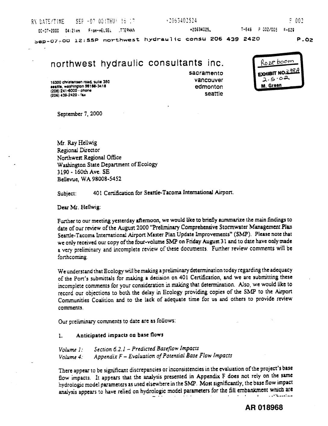 _e_-07-OO _2:55P northwesi: hy_rauli{ ¢ontU 206 439 24Z0 P.02 northwest hydraulic consultantssacramentoinc. 16300ch_Nmlen toad.Suite3S0 VaNCOUVer ..me,,._.,_Jn_:o._1u-_, s edmonton (20@241"6000"ohone (206}4]9-2420- fl_ seattle September 7, 2000 Mr. Ray Hel[wig ILegion_l DLrector Northwest ResJonal OfBce Waddn&,toa State Depa_xment of Ecology 3190- 160t.h Ave. SE Bellevue, WA 98008-5452 Subject: 401Cemficat.ion for Seattle-Tacoma International Airport. - Dear/Ca. HelIwig: Further to our meeting yesterday edtemoon, we would Liketo briefly summa.,ize the main findings to date of our review of the August 2000 "PrelJminL5,ComprehensiveStormwater Management PJ_n Seat'Je-Tacoma I.nternational Airport Master Plan Update Improvements" (SMP), Please note that we onlyreceivedourcopyofthefour-volumeSI_PonFridayAugust31 andtodatehaveonlymade a verypreli_naryand incompletereviewofthesedocuments.Furtherreviewcomments willbe forthcoming We understandthatEcology will bemaking aprelimina_ determinationtodayregarding theadequacy of the Port's subrmttals for making a decision on 401 Certification, and we are submitting these incomplete cornmemsfor your considerationhamakingthat determination. Also. we would like to recordourobjectionstoboththedelaym Ecologyprovidingcopiesof theSMP totheAirport Communities Co=die,onand to the tack of adequate time for us and others to provide review cozntT_r_ts. Our preliminary commentstodate are asfollows: 1. Anticipated impacts on base flows Volume 1." Section 6.2. ] - Predicted Baseflow Impacts Volume 4: Appendix F - Evaluation of Potential Base Flow Impacts Thereappeartobesignificantdiscrepanciesor inconsistenciesintheevaluationoftheproject'sbase flow impacts. It appearsthat the atudysispresented in Appendix F does not rely on the same hydrologicmodel ptrametessasusedelsewherein the SM:P.Most significantly, the baseflow impact a,'udysisappears:ohavereliedonhydrologicmodelparametersforthefillembanXmentwniclaare AR 018968 '_ _!_!E S_D " , R._D_,E/, ., -07'O0(THU! [c !7 +;063402524 F C03 0l:-C1-2_0_O_:22_e _:r:m-i_ELSEL"" ' ._V,.N 4Gl=',?-6an ; C;3/0_5 F-6211 Sap-07.00 12:B6P northwest hjtarauli¢ consu 206 439 2420 P.03 September 7,2000 oftheHSPI=modeltoac&ua/_embankmentrunoi_'daza.We haveattemptedtorepeattheanalysis presented LnAppendix 1_ using the…