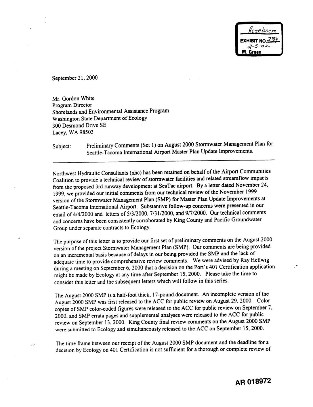 Subject: Preliminary Comments (Set 1) on August 2000 Stormwater Management Plan for Seattle-Tacoma International Airport Master Plan Update Improvements. Northwest Hydraulic Consultants (nhc) has been retained on behalf of the Airport Communities Coalition to provide a technical review of stormwater facilities and related streamflow impacts from the proposed 3rd runway development at SeaTac airport. By a letter dated November 24, 1999, we provided our initial comments from our technical review of the November 1999 version of the Stormwater Management Plan (SMP) for Master Plan Update Improvements at Seattle-Tacoma International Airport. Substantive follow-up concerns were presented in our email of 4/4/2000 and letters of 5/3/2000, 7/31/2000, and 9/7/2000. Our technical comments and concerns have been consistently corroborated by King County and Pacific Groundwater Group under separate contracts to Ecology. The purpose of this letter is to provide our first set of preliminary comments on the August 2000 version of the project Stormwater Management Plan (SMP). Our comments are being provided on an incremental basis because of delays in our being provided the SMP and the lack of adequate time to provide comprehensive review comments. We were advised by Ray Hellwig during a meeting on September 6, 2000 that a decision on the Port's 401 Certification application ." might be made by Ecology at any time after September 15, 2000. Please take the time to consider this letter and the subsequent letters which will follow in this series. The August 2000 SMP is a half-foot thick, 17-pound document. An incomplete version of… -