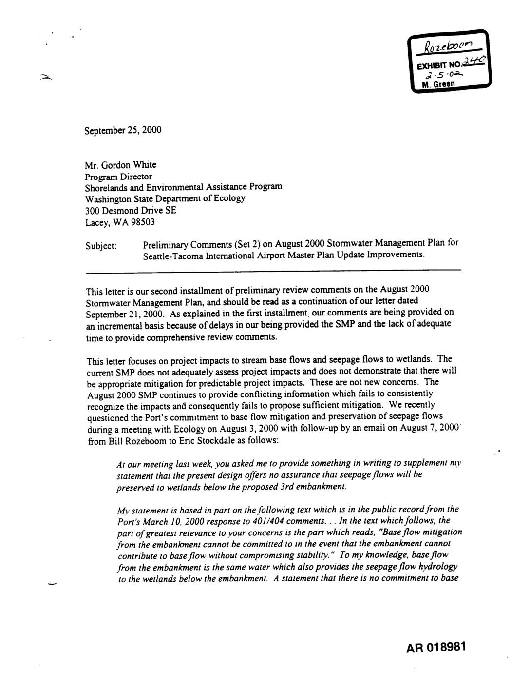 Subject: Preliminary Comments (Set 2) on August 2000 Stormwater Management Plan tbr Seattle-Tacoma International Airport Master Plan Update Improvements. This letter is our second installment of preliminary review comments on the August 2000 Stormwater Management Plan, and should be read as a continuation of our letter dated September 2 l, 2000. As explained in the first installment: our comments are being provided on an incremental basis because of delays in our being provided the SMP and the lack of adequate time to provide comprehensive review comments. This letter focuses on project impacts to stream base flows and seepage flows to wetlands. The current SMP does not adequately assess project impacts and does not demonstrate that there will be appropriate mitigation for predictable project impacts. These are not new concerns. The August 2000 SMP continues to provide conflicting information which fails to consistently recognize the impacts and consequently fails to propose sufficient mitigation. We recently questioned the Port's commitment to base flow mitigation and preservation of seepage flows during a meeting with Ecology on August 3, 2000 with follow-up by an email on August 7, 2000 from Bill Rozeboom to Eric Stockdale as follows: At our meeting last week, you asked me to provide something in writing to supplement my statement that the present design offers no assurance that seepage flows will be preserved to wetlands below the proposed 3rd embankment. My statement is based in part on the following text which is in the public record from the Port's March… -