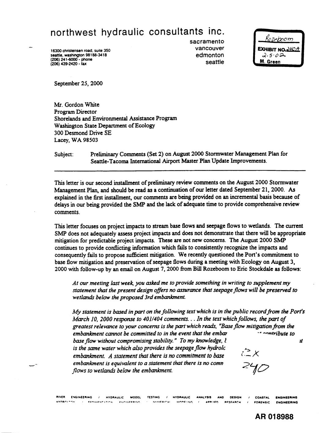 northwest hydraulic consultantSsacramentoinC. ]I16300 christensenroad, suite350 vancouver | EXHIBIT NO:2_'_,_seattle,washington98188-3418 edmonton | ,2.5-0._(206) 241-6000 - phone(20e)439-242o- tax seattle • M. Green September 25, 2000 Mr. GordonWhite ProgramD.'ector Shorelands and Environmental AssistanceProgram Wasl_gton State Department of Ecology 300 Desmond Drive SE Lacey, WA 98503 Subject: Pre"luninaryComments (Set 2) on August 2000 Stormwater Management Plan for Seattle-Tacoma International Airport Master Plan Update Improvements. This letter is our secondinstallmentofpre"hminaz7reviewcommentson the August 2000 Stormwater ManagementPlan, and shouldbe readasa continuationof our letterdatedSeptember21, 2000. As explainedin the first installment,our commentsare being provided on an incrementalbasisbecauseof delaysin our being provided the SMP andthe lackof adequatetime to provide comprehensivereview comments. This letter focuseson projectimpactsto streambaseflows and seepageflows to wetlands. The current SMP doesnot adequatelyassessprojectimpactsand doesnot demonstratethat there will be appropriate mitigationfor predictableproject impacts. Theseare not new concerns.The August 2000 SMP continuesto provide conflicting information which failsto consistentlyrecognizethe impactsand consequentlyfailsto proposesufficientmitigation. We recentlyquestionedthePort's commitmentto baseflow mitigationand preservationof seepageflows duringa meetingwith Ecology on August 3, 2000 with follow-up byan email on August7, 2000 from Bill Rozeboomto Eric Stockdaleas follows: At our meeting last week, you asked me to provide something in writing to supplement my ytatement that the present design offers no assurance that seepage flows will be preserved to wetlands below the proposed 3rd embanlonent. My statement is based in part on the following text which is m the public record from the Port's March 10, 2000 response to 401/404 comments... In the text which follows, the part of greatest relevance to your concerns is the part which reads,… -