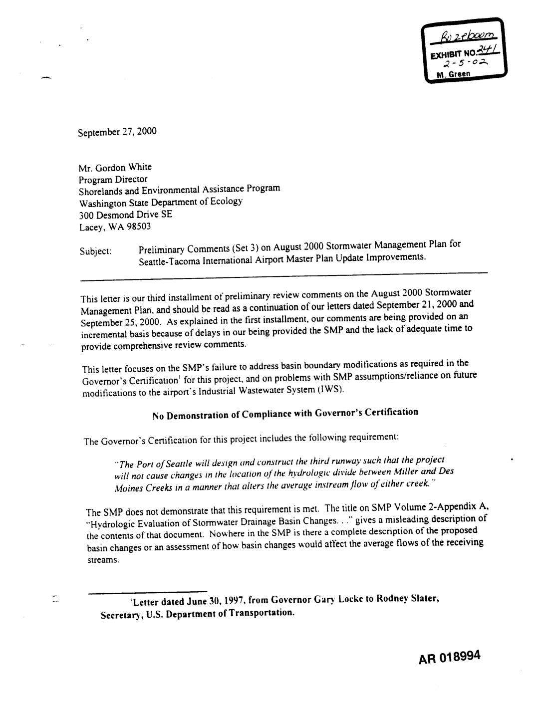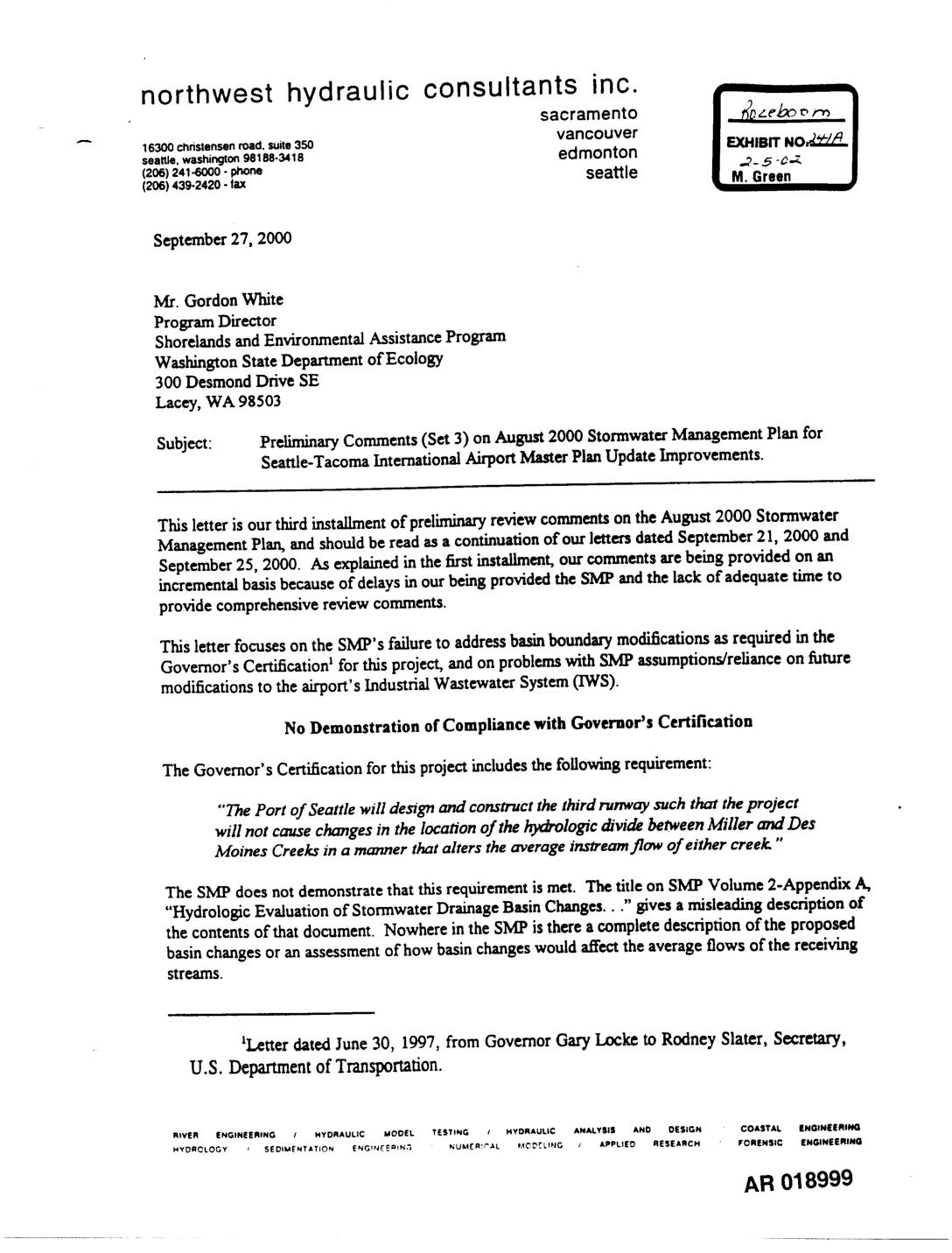 A 16300 christen,senroad. Suite350 vancouver I EXHIBIT NO_ "y')_/ I seattle, washington98188-3418 edmonton • ..?_._-c.:. I (2o6)241-eooo._ seattle • M. Green(206) 439-2420 - ILX September27, 2000 Mr. GordonWhite ProgramDirector ShorelandsandEnvironmentalAssistanceProgram WashingtonStateDepartmentof Ecology 300 Desmond Drive SE Lacey, WA 98503 Subject: Preliminary Comments (Set 3) on August 2000 Stormwater Management Plan for Seattle-Tacoma International Airport Master Plan Update Improvements. This letter is ourthird installmentof preliminaryreviewcommentson theAugust 2000 Stormwater ManagementPlan, and shouldbe readasa continuationof ourlettersdatedSeptember21, 2000 and September25, 2000. As explainedinthefirst instaJlment_ourcommentsarebeingprovidedon an incrementalbasisbecauseof delaysin ourbeingprovidedthe SMP andthe lack of adequatetime to providecomprehensivereview comments. This letter focusesonthe SMP's failureto addressbasinboundarymodificationsasrequiredin the Governor'sCertificationI for thisproject,and on problemswith SMP assumptions/relianceon future modificationsto the airport'sIndustrial WastewatexSystem(IWS). No Demonstration of Compliance with Governor's Certification The Governor's Certification for this project includes the following requirement: "'ThePort of Seattle will design and construct the third runway xuch that the project will not cause changes in the locat_on of the hydrologic divide between Miller and Des Haines Creeks in a manner that alters the average instream flow of either creek." The SMP does not demonstrate that this requirement is met. The title on SMP Volume 2-Appendix A, "Hydrologic Evaluation of Stormwater Drainage Basin Changes..." 8ires a misleading description of the contents of that document. Nowhere in the SMP is there a complete description of the proposed basin changes or an assessment of how basin changes would affect the average flows of the receiving streams. ILetter dated June 30, 1997, from Governor Gary Locke to Rodney Slat, r, Secretary, U.S.… -