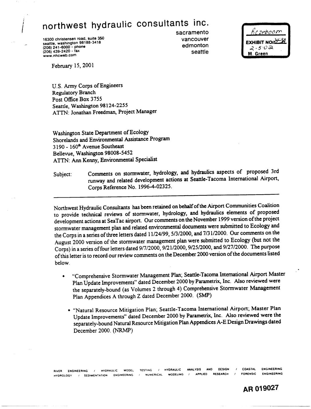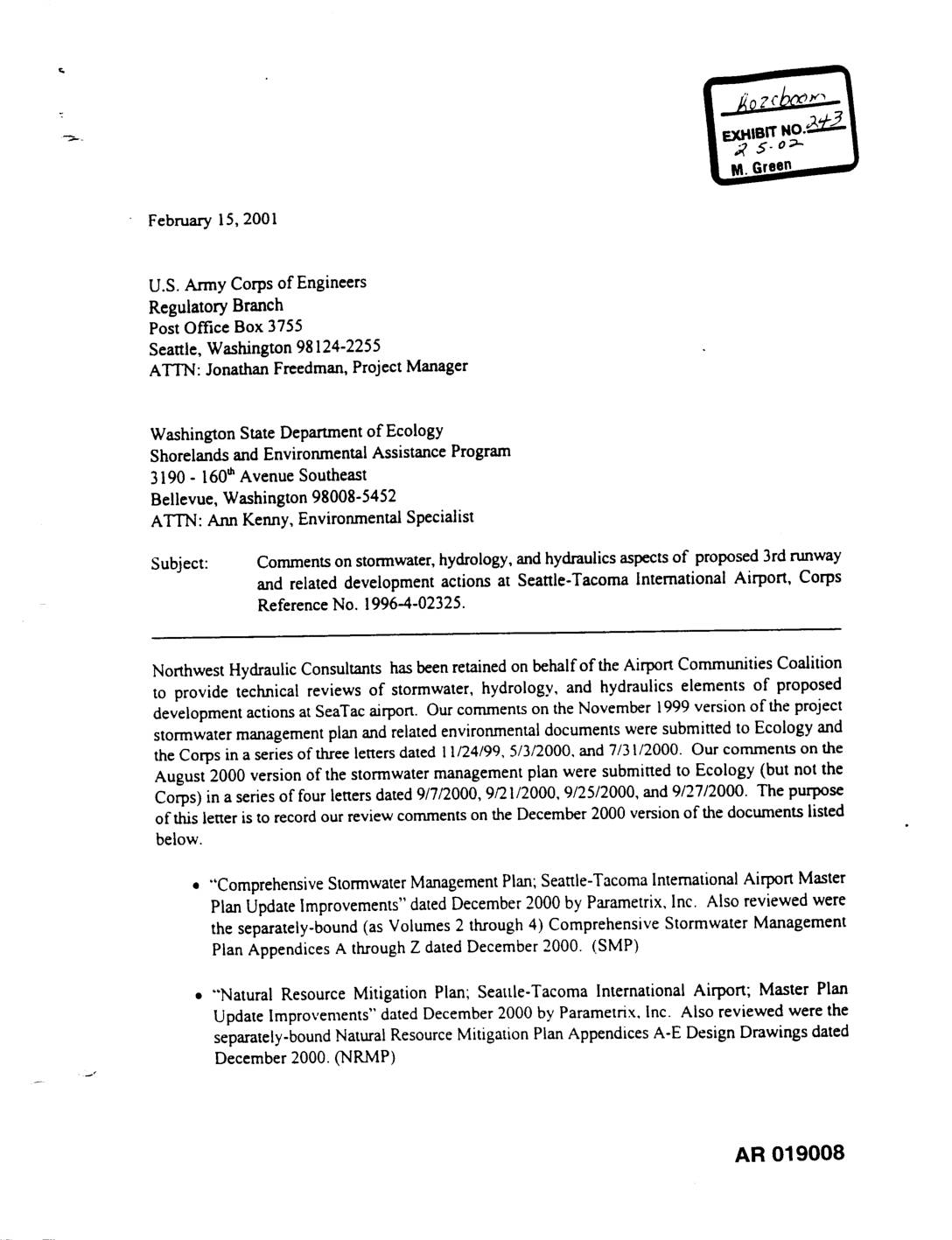 Subject: Comments on stormwater, hydrology, and hydraulics aspects of proposed 3rd runway and related development actions at Seattle-Tacoma International Airport, Corps Reference No. 1996-4-02325. Northwest Hydraulic Consultants has been retained on behalf of the Airport Communities Coalition to provide technical reviews of stormwater, hydrology, and hydraulics elements of proposed development actions at SeaTac airport. Our comments on the November 1999 version of the project stormwater management plan and related environmental documents were submitted to Ecology and the Corps in a series of three letters dated I1/24/99, 5/3/2000, and 7/31/2000. Our comments on the August 2000 version of the stormwater management plan were submitted to Ecology (but not the Corps) in a series of four letters dated 9/7/2000, 9/21/2000, 9/25/2000, and 9/27/2000. The purpose of this lener is to record our review comments on the December 2000 version of the documents listed below. • "'Comprehensive Stormwater Management Plan; Seattle-Tacoma International Airport Master Plan Update Improvements" dated December 2000 by Parametrix, Inc. Also reviewed were the separately-bound (as Volumes 2 through 4) Comprehensive Stormwater Management Plan Appendices A through Z dated December 2000. (SMP) • "'Natural Resource Mitigation Plan; Seattle-Tacoma International Airport; Master Plan Update Improvements" dated December 2000 by Parametrix, Inc. Also reviewed were the separately-bound Natural Resource Mitigation Plan Appendices A-E Design Drawings dated December 2000. (NRMP) AR 019008 ,, "Wetland Functional Assessment and Impact Analysis; Master Plan Update lmprovemems; Seattle-Tacoma International Airport" dated December 2000 by Parametrix, Inc. (WFA) Our qualifications to perform this review were described in our… -