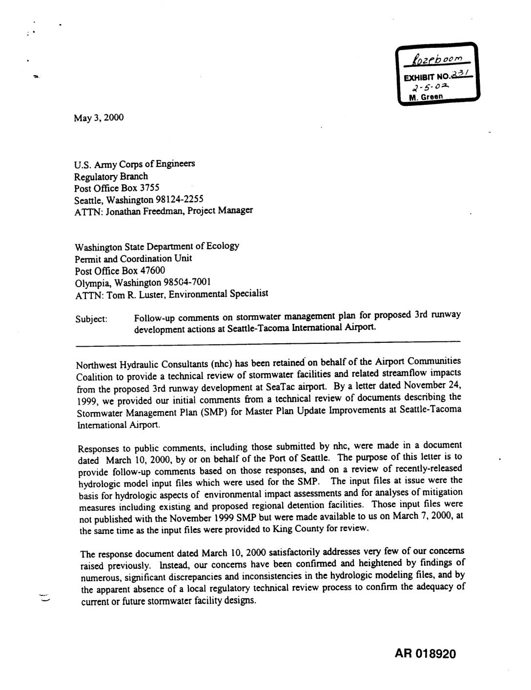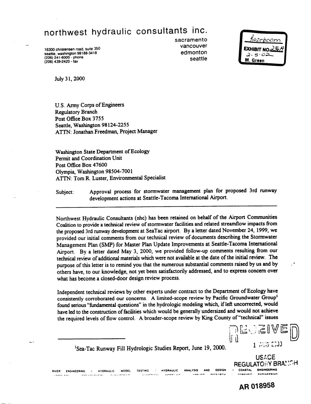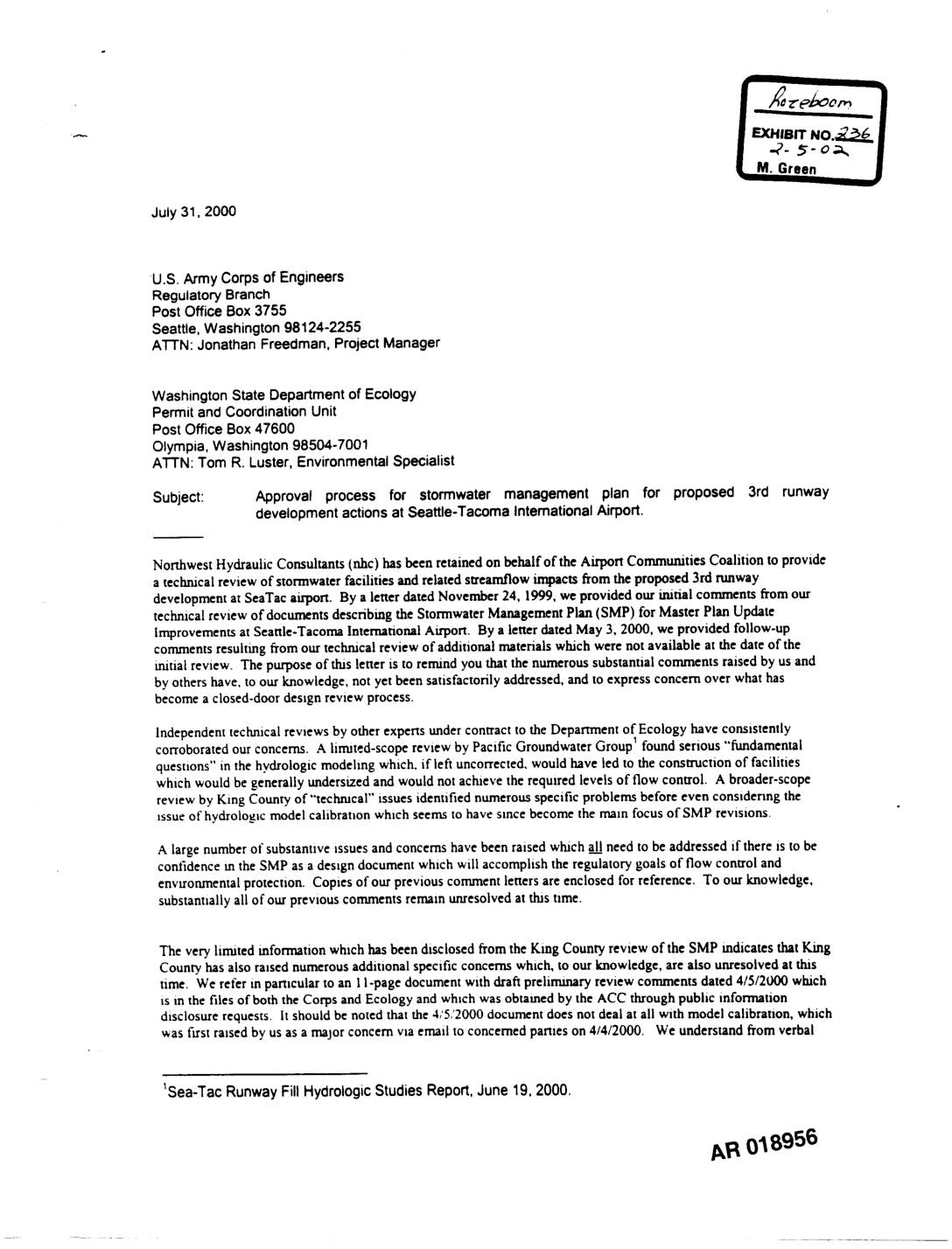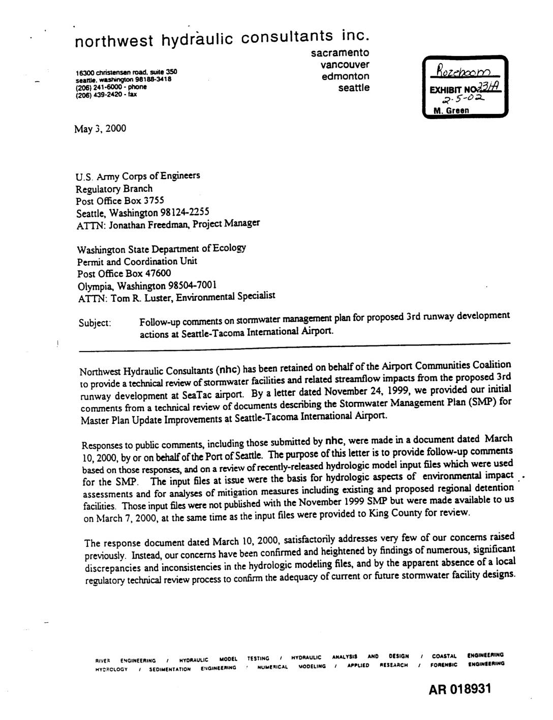 "- 16300 christensenroad, suite350 vancouver |EXHIBIT NO_| seattle, washington98188-3418 edmonton I "_- 5- o-_.._ | (206)(206)439-2420241"6000--laxPh°ne seattle • M. Green W July 31, 2000 U.S. Army Corps of Engineers Regulatory Branch Post Office Box 3755 Seattle, Washington 98124-2255 ATTN: Jonathan Freedman, Project Manager Washington State Department of Ecology Permit and Coordination Unit Post Office Box 47600 Olympia, Washington 98504-7001 ATTN: Tom R. Luster, Environmental Specialist Subject: Approval process for stormwater management plan for proposed 3rd runway ..... development actions at Seattle-Tacoma International Airport. Northwest Hydraulic Consultants (nhc) has been retained on behalf of the Airport Communities Coalitionto provide a technical review of stormwater facilities and related streamflow impacts from the proposed 3rd runwaydevelopment at SeaTac airport. By a letter dated November 24, 1999, we provided our initial comments from our technical review of documents describing the Stormwater Management Plan (SMP) for Master Plan Update Improvements at Seattle-Tacoma International Airport. By a letter dated May 3, 2000, we provided follow-up comments resulting from our technical review of additionalmaterials which were not availableat the date of the initial review. The purpose of this letter is to remind you that the numerous substantial comments raised by us and by ." others have, to our knowledge, not yet been satisfactorily addressed, and to express concern over what has become a closed-door design review process. Independenttechnicalreviewsby otherexpertsundercontractto the Departmentof Ecologyhave consistentlycorroboratedour concerns. A limited-scopereview by Pacific GroundwaterCroup1 foundserious"fundamentalquestions"in thehydrologicmodelingwhich, if leftuncorrected,would haveledto theconstructionof facilitieswhich would be generallyundersizedandwould not achieve the requiredlevelsof flow control. A broader-scopereview… -