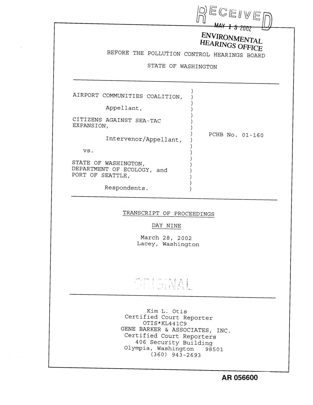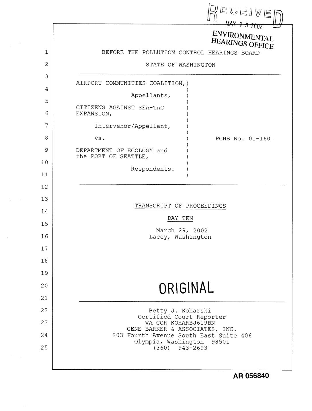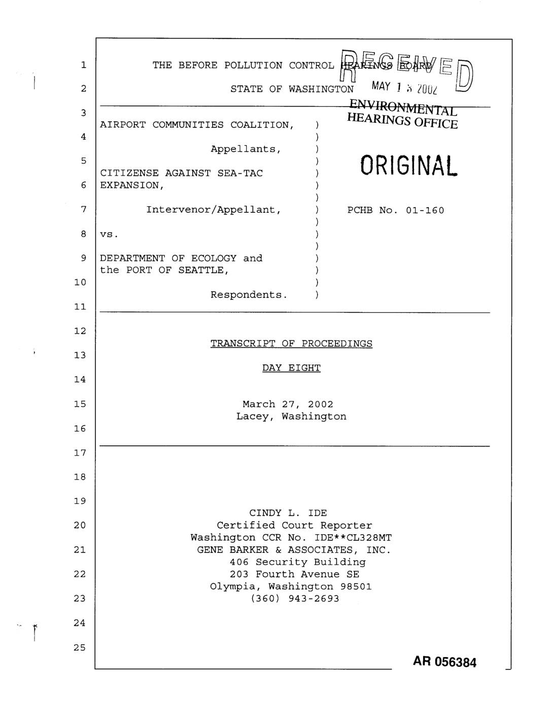Appearances: PETER J. EGLICK; KEVIN L. STOCK; MICHAEL WITEK; HELSELL FETTERMAN; RACHAEL PASCHAL OSBORN; RICHARD A. POULIN; JEFF B. KRAY; JOAN MARCHIORO; THOMAS J. YOUNG; GILLIS E. REAVIS; ROGER PEARCE; STEVEN G. JONES; MICHAEL CHEYNE; CHARLES "PONY" ELLINGSON; LINN GOULD; ELIZABETH CLARK; JOHN STRUNK; NUMBER DESCRIPTION IDENTIFIED ADMITTED | Witnesses: MICHAEL CHEYNE; CHARLES "PONY" ELLINGSON; LINN GOULD; ELIZABETH CLARK; JOHN STRUNK | Exhibits: 1023 Resume and Curriculum Vita for expert witnesses; 0045 Letter from Northwest Hydraulics Consultants to Corps of Engineers 11-26-01; 0804 Amendment to Interlocal Agreement between City of SeaTac and Port of Seattle; 1178 Pacific Groundwater Group Hydrologic Studies Report; 1305 Pacific Groundwater Group SeatTac Third Runway Embankment Fill Modeling in Support of Low Streamflow Analysis 11-27-01; 1118 Parametrix Water Effect Ratio Screening Study at STIA; 0649 Memorandum from Todd Pollard to Keith Smith 2/29/00; 0686 2001 City of Des Moines Water Quality Monitoring Program; 0005 WAC 173-201A; 0285 1998 Soil Fill Acceptance Criteria; 0286 1999 Soil Fill Acceptance Criteria; 0294 Third Runway Project Off Site Borrow Source Baseline Chemical Characterization -