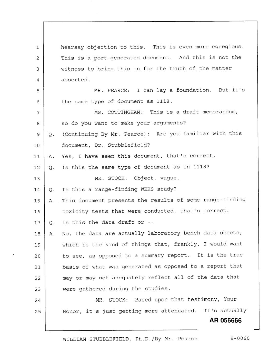 hearsay objection to this. This is even more egregious. This is a port-generated document. And this is not the witness to bring this in for the truth of the matter asserted. MR. PEARCE: I can lay a foundation. But it's the same type of document as 1118. MS. COTTINGHAM: This is a draft memorandum, so do you want to make your arguments? Q. (Continuing By Mr. Pearce) : Are you familiar with this document, Dr. Stubblefield? A. Yes, I have seen this document, that's correct. Q. Is this the same type of document as in 1118? MR. STOCK: Object, vague. Q. Is this a range-finding WERS study? A. This document presents the results of some range-finding toxicity tests that were conducted, that's correct. Q. Is this the data draft or -- A. No, the data are actually laboratory bench data sheets, which is the kind of things that, frankly, I would want to see, as opposed to a summary report. It is the true basis of what was generated as opposed to a report that may or may not adequately reflect all of the data that were gathered during the studies. MR. STOCK: Based upon that testimony, Your Honor, it's just getting more attenuated. It's actually AR 056666 WILLIAM STUBBLEFIELD, Ph.D./By Mr. Pearce 9-0060 now double hearsay, where attached to this port memorandum is lab results. No one is hear from the lab to cross examine. Dr. Stubblefield can't be cross examined on the lab results. He can't be cross… -