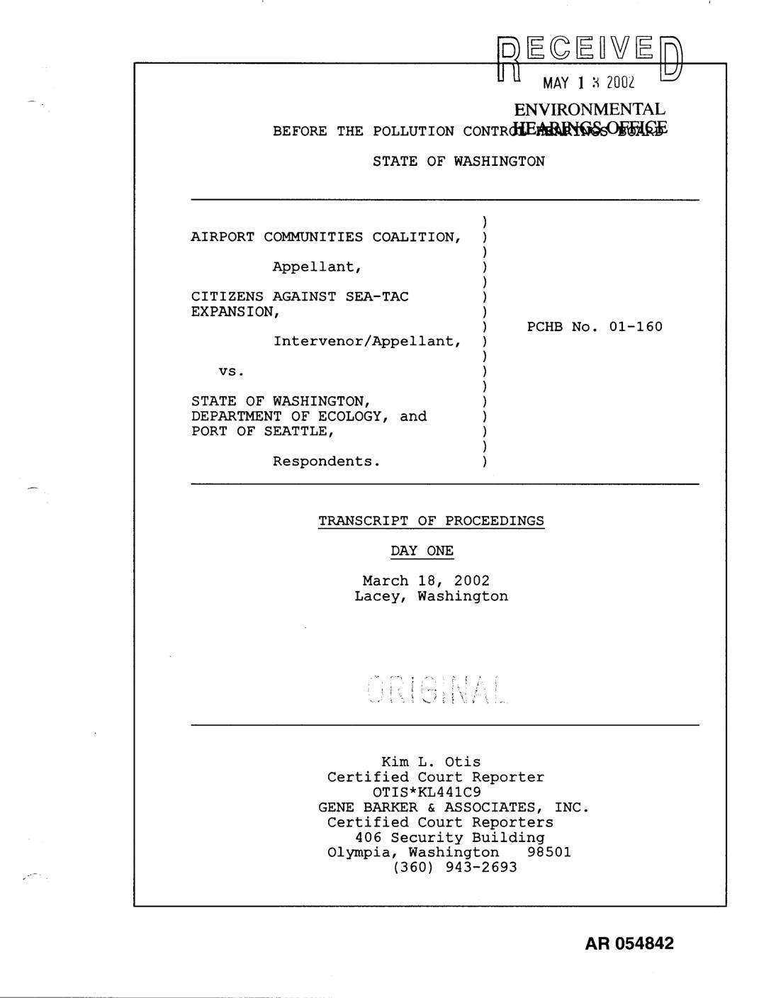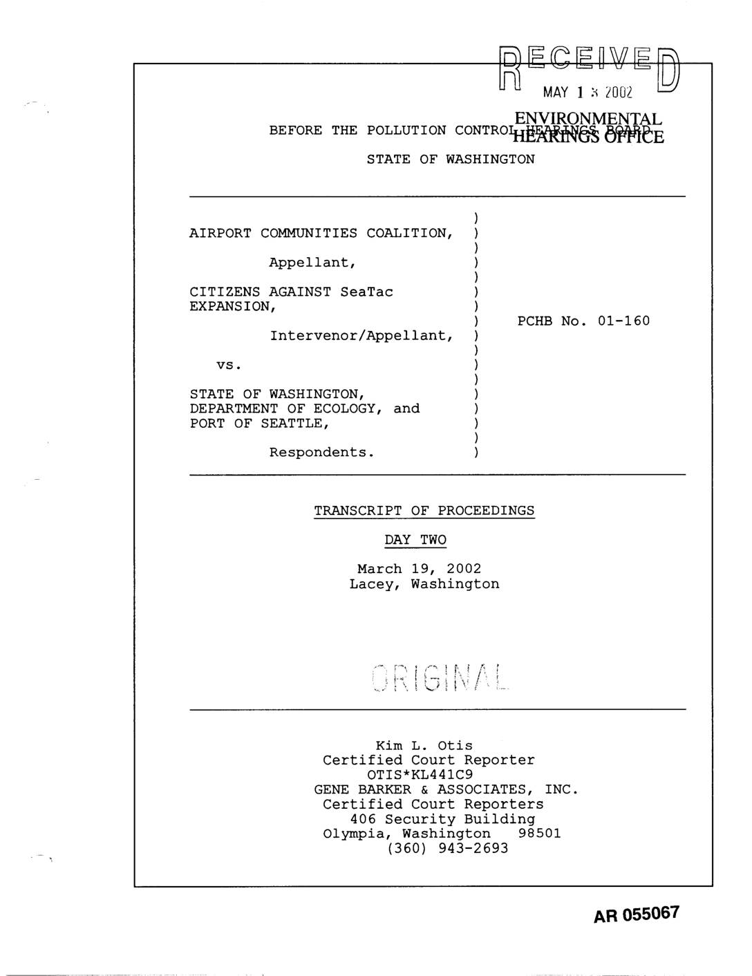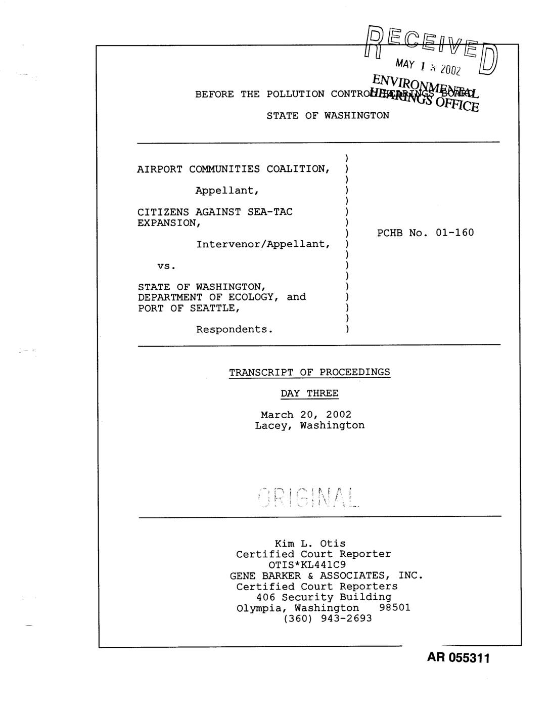 Appearances: PETER J. EGLICK; KEVIN L. STOCK; MICHAEL WITEK; HELSELL FETTERMAN; RACHAEL PASCHAL OSBORN; RICHARD A. POULIN; JEFF B. KRAY; JOAN MARCHIORO; THOMAS J. YOUNG; GILLIS E. REAVIS; ROGER PEARCE; STEVEN G. JONES; EDWARD O'BRIEN; CHING-PI WANG; KATIE WALTER; ERIK STOCKDALE; NUMBER DESCRIPTION IDENTIFIED ADMITTED | Witnesses: EDWARD O'BRIEN; CHING-PI WANG; KATIE WALTER; ERIK STOCKDALE | Exhibits: 0015 Email from Peter Kmet to Kevin Fitzpatrick 9-11-00; 0033 Email from Chung Yee to Kevin Fitzpatrick 9-11-00; 0022 Email from Chung Yee to Kevin Fitzpatrick 6-13-01; 0037 Email from Peter Kmet to Kevin Fitzpatrick 6-27-01; 2126 Ecology Implementation Memo No. 3, 11-24-93; 0607 Email from Chung Yee to Peter Kmet, 6-27-01; 0262 USFWS Biological Opinion; 0027 Email from Pete Kmet to Chung Yee 6/27; 0080 Declaration of Edward O'Brien; 0072 Agreed Order; 0532 Letter from Tom Fitzsimmons to Kevin Stock 4-11-01; 1254 Associates Earth Sciences Technical Memorandum - Anyalsis of Preferential Ground Water Flow Paths Relative to Proposed Third Runway -