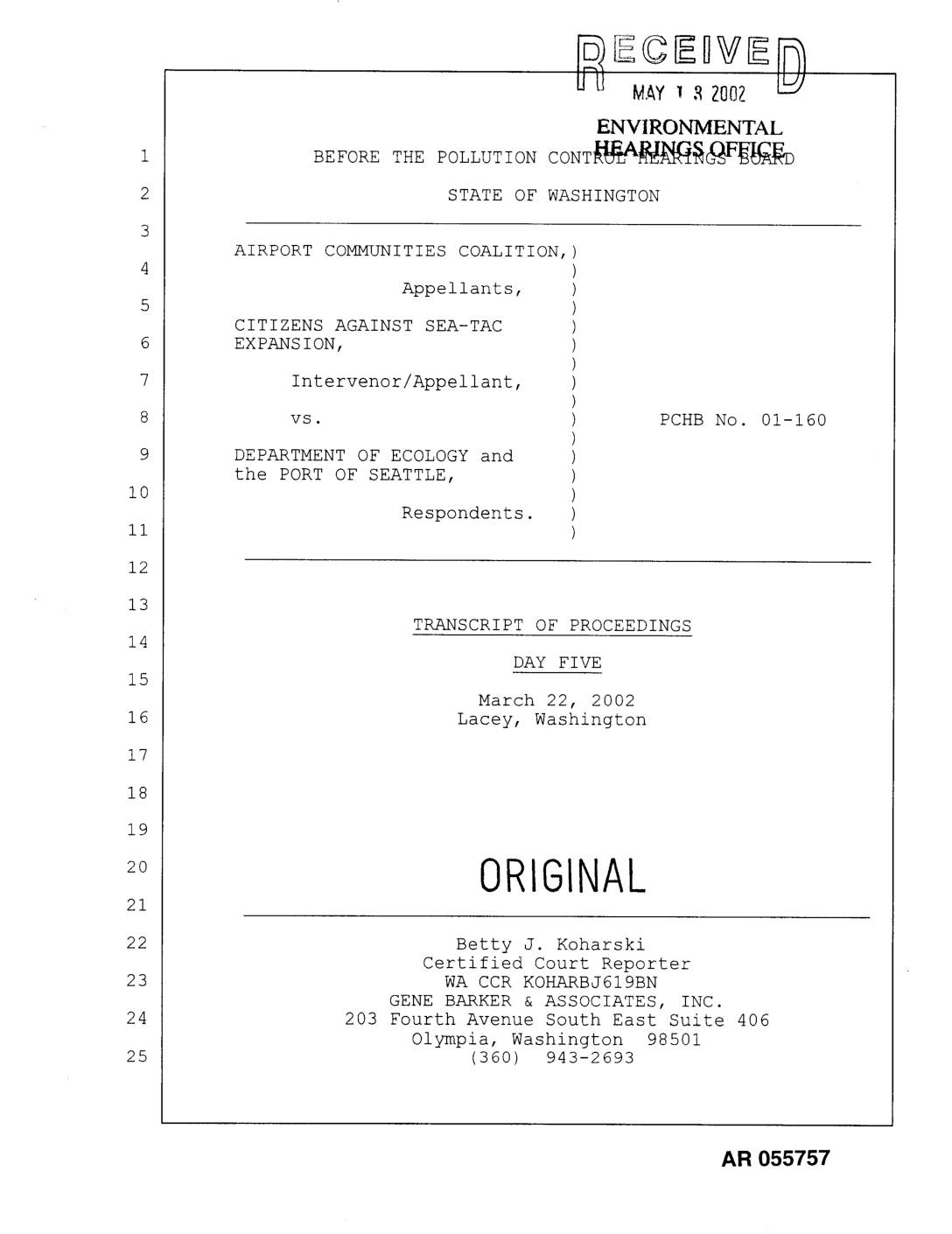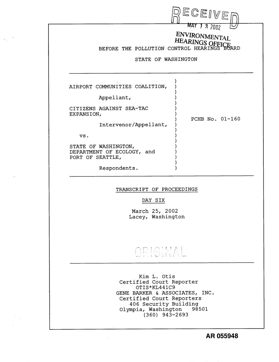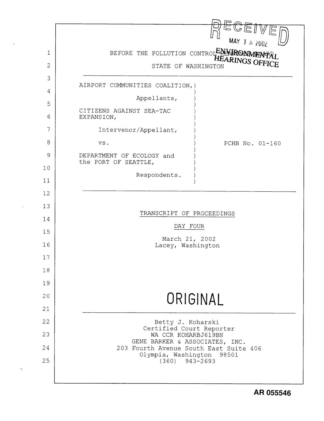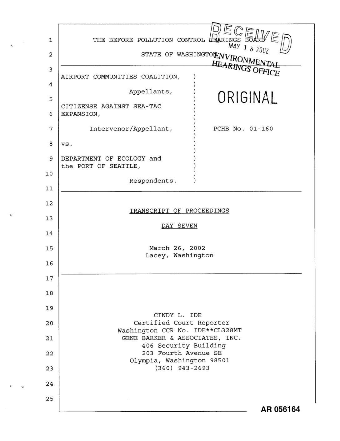 Appearances: PETER J. EGLICK; KEVIN L. STOCK; MICHAEL WITEK; HELSELL FETTERMAN; RACHAEL PASCHAL OSBORN; RICHARD A. POULIN; JEFF B. KRAY; JOAN MARCHIORO; THOMAS J. YOUNG; GILLIS E. REAVIS; ROGER PEARCE; STEVEN G. JONES; EDWARD O'BRIEN; CHING-PI WANG; KATIE WALTER; ERIK STOCKDALE; NUMBER DESCRIPTION IDENTIFIED ADMITTED | Witnesses: EDWARD O'BRIEN; CHING-PI WANG; KATIE WALTER; ERIK STOCKDALE | Exhibits: 0015 Email from Peter Kmet to Kevin Fitzpatrick 9-11-00; 0033 Email from Chung Yee to Kevin Fitzpatrick 9-11-00; 0022 Email from Chung Yee to Kevin Fitzpatrick 6-13-01; 0037 Email from Peter Kmet to Kevin Fitzpatrick 6-27-01; 2126 Ecology Implementation Memo No. 3, 11-24-93; 0607 Email from Chung Yee to Peter Kmet, 6-27-01; 0262 USFWS Biological Opinion; 0027 Email from Pete Kmet to Chung Yee 6/27; 0080 Declaration of Edward O'Brien; 0072 Agreed Order; 0532 Letter from Tom Fitzsimmons to Kevin Stock 4-11-01; 1254 Associates Earth Sciences Technical Memorandum - Anyalsis of Preferential Ground Water Flow Paths Relative to Proposed Third Runway -