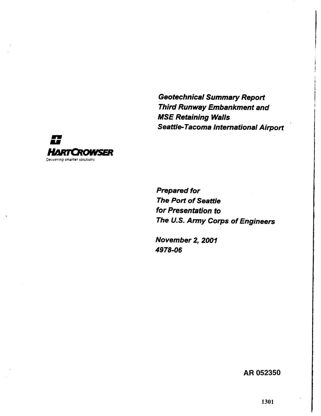 This report describesthe engineering process used to address design issues related to soil conditions, groundwater, and potential earthquakes for the proposed Third Runway at SeatlJe-Tacoma International Airport (STIA). Overall, the runway project will include placement of 17,000,000 cubic yards of compacted fill, 3,000,000 cubic yards of excavation, and construction of three "mechanically stabilized earth" (MSE) retaining walls that range from 50 to 135 feet in maximum heighL The executive summary of this report describes its purpose, general contents of the report, and results of the engineering analysis. A key part of the work described herein has been the involvement of an independent technical review board composed of distinguished experts to provide input into the geotechnical design process. The main part of this report summarizes the geotechnical data collection and engineering analysesaccomplished over a multi-year period by the Port of Seattle. The Seattle District, US Army Corps of Engineers (Corps) requested this executive summary as part of its review of the Third Runway Project. Scope and Purpose of This Report The scope of this report is to address the following: • Introduce the reader to the design team and explain what each firm's role has been, including the involvement of outside reviewers; • Describe the main features of the embankment and MSE retaining walls that are addressed in this report; • Summarize information that has been collected on soil and groundwater conditions at the Third Runway site; • Generally describe how the Port has studied the risk posed by earthquakes, and… -