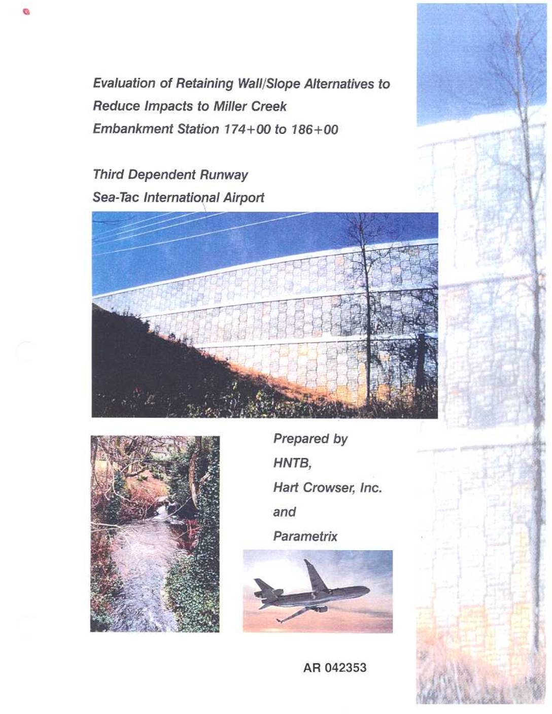 17900 INTERNATIONAL BLVD. ,J U L i d i999 SUITE301 SEATTLE, WA 98188 FOSTER PEPPER 8r, PHONE: (206)431-4970 SHEF'_,L]Vq " '*' .,.-,7 L.C TRANSMITTAL RECORD TO: Tom Walsh DATE: July 13, 1999 _T_ Enclosed please find one copy of the Wall/Slope Evaluation Document. X For Review and Approval Approved as Noted Approved Resubmit for Approval Not Approved Other: (see remarks) REMARKS: Your review comments are appreciated. Please note that my team and I would be happy to meet with you to discuss specific mitigation elements, comments, and/or issues. Our goal is to initiate renotice of our permit no later than August 6, 1999. Thank you for your assistance in this time sensitive issue. Very Truly yours, Barbara Hinkle AR 042354 COPYTO: Port of Seattle: Michael Cheyne, Traci Goodwin, . -_- John Rothnie, EarlMunday, Mary Vigilante, Jim ..... Thomson, Elizabeth Leavitt Foster, Pepper, & Sheffleman: Tom Walsh U.S. Army Corps of Engineers: Jonathon Freedman Department of Ecology: Erik Stockdale, Tom Luster, Ray Helwig, Kevin Fitzpatrick FAA: Cayla Morgan USFWS: Nancy Brennan-Dubbs USDA Wildlife Services: Roger Woodruff King County: David Masters WA Dept. ofFish and Wildlife: Phil Schneider U.S.E.P.A.: Steve Roy o 2355 TABLE OF CONTENTS Paqe EXECUTIVE SUMMARY ES-1 Introduction ES-1 Overview of the Evaluation Process ES-2 Summary of the Recommended Alternative ES-4 TABLE OF CONTENTS INTRODUCTION 1 SECTION 1 EXISTING CONDITIONS 1-1 Background 1-1 Site Description 1-1 2H: 1V Fill Slope Not a Viable Option for This Area 1-2 SECTION 2 EVALUATION OF GEOMETRIC ALTERNATIVES TO MINIMIZE OR AVOID CREEK…