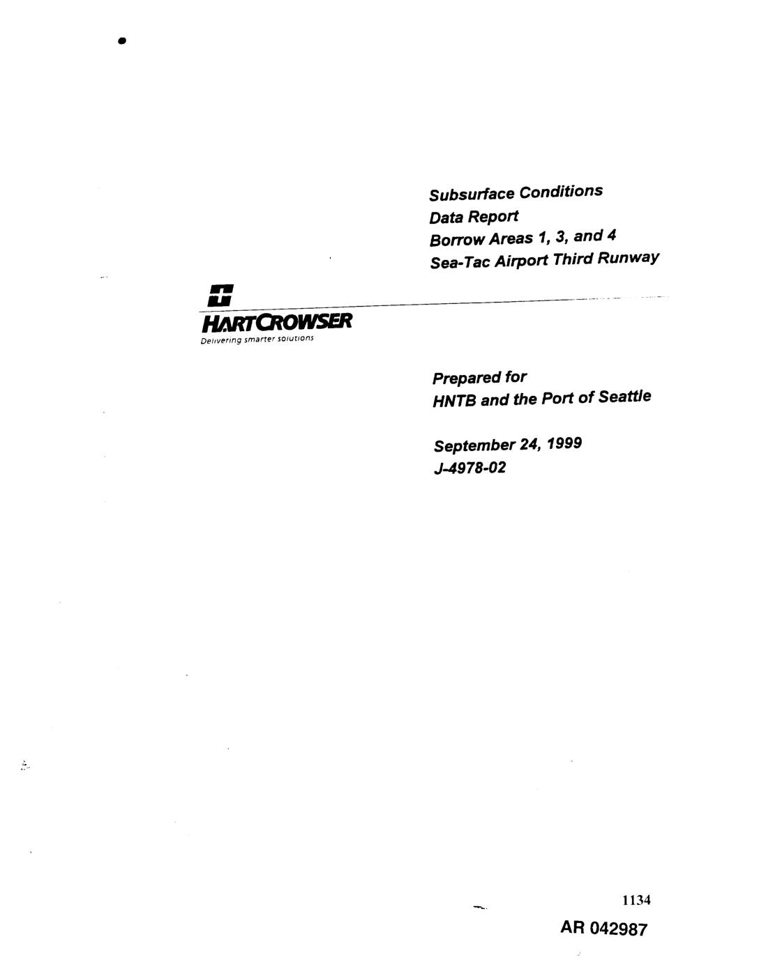 FROM: ReeseP. Hastingsand Michael J.Bailey, P.E.,Hart Crowser, Inc. RE: Third Runway Project, Borrow Areas I, 3, and 4 Projected Impacts to Wetlands J-4978-02 CC: JamesC. Kelley, Ph. D., Parametrix, Inc. J.Thomson, P.E.,HNTB On-site Borrow A ctivities This memorandum quantifies the potential impacts to wetland resources resulting from development of Borrow Areas 1, 3, and 4, and an on-site haul route for use in the construction of the Third Runway embankment. Completion of the Third Runway embankment will require about million cubic yards of compacted earth fill. Use of borrow sites owned by the Port of Seattle (Port) to provide this material will significantly reduce air quality and local traffic impacts associated with haulage from off-site sources. The Final Environmental Impact Statement (FEIS)(prepared for Sea-TacInternational Airport's Proposed Master Plan update development actions) discussed development of construction fill material borrow areasfrom eight identified sources within property controlled by the Port. Based on several factors (wetlands impacts, material types, operational costs) the FinalSupplemental Environmental Impact Statement (FSEIS)indicated that four of these eight on-site resource areas could likely be used to extract a maximum quantity of 15.45 million cubic yards of fill material. Further study by the Port has focused on the Borrow Areas designated 1, 3, and 4, which are proposed to provide a combined total of 7.9 million cubic yards. Figure 1 - Site Location Map shows the location of Borrow Areas 1, 3, and 4. AR 042613 Port of Seattle J-4978-02 July 9, 1999 Page 2 Original resource estimates for two… -