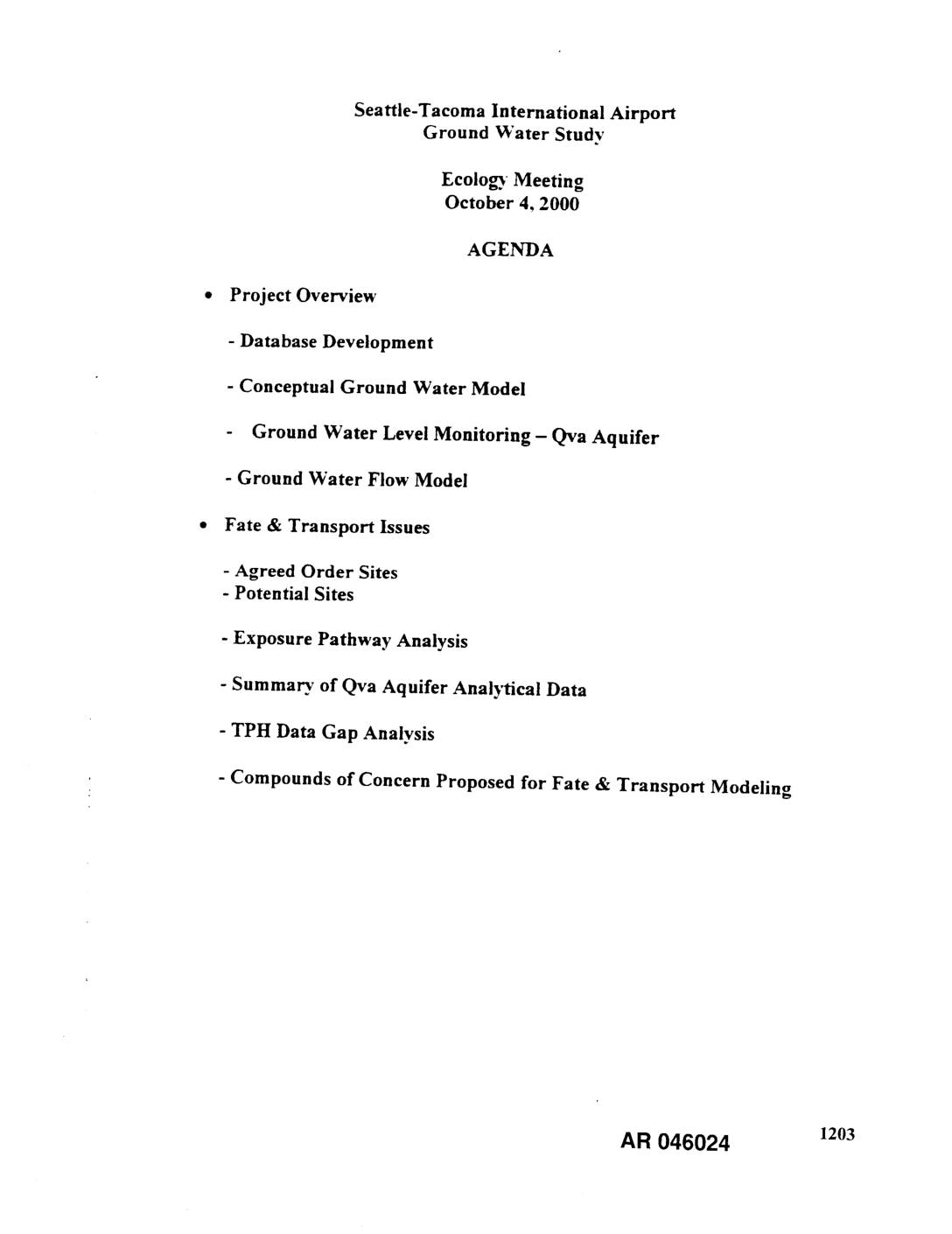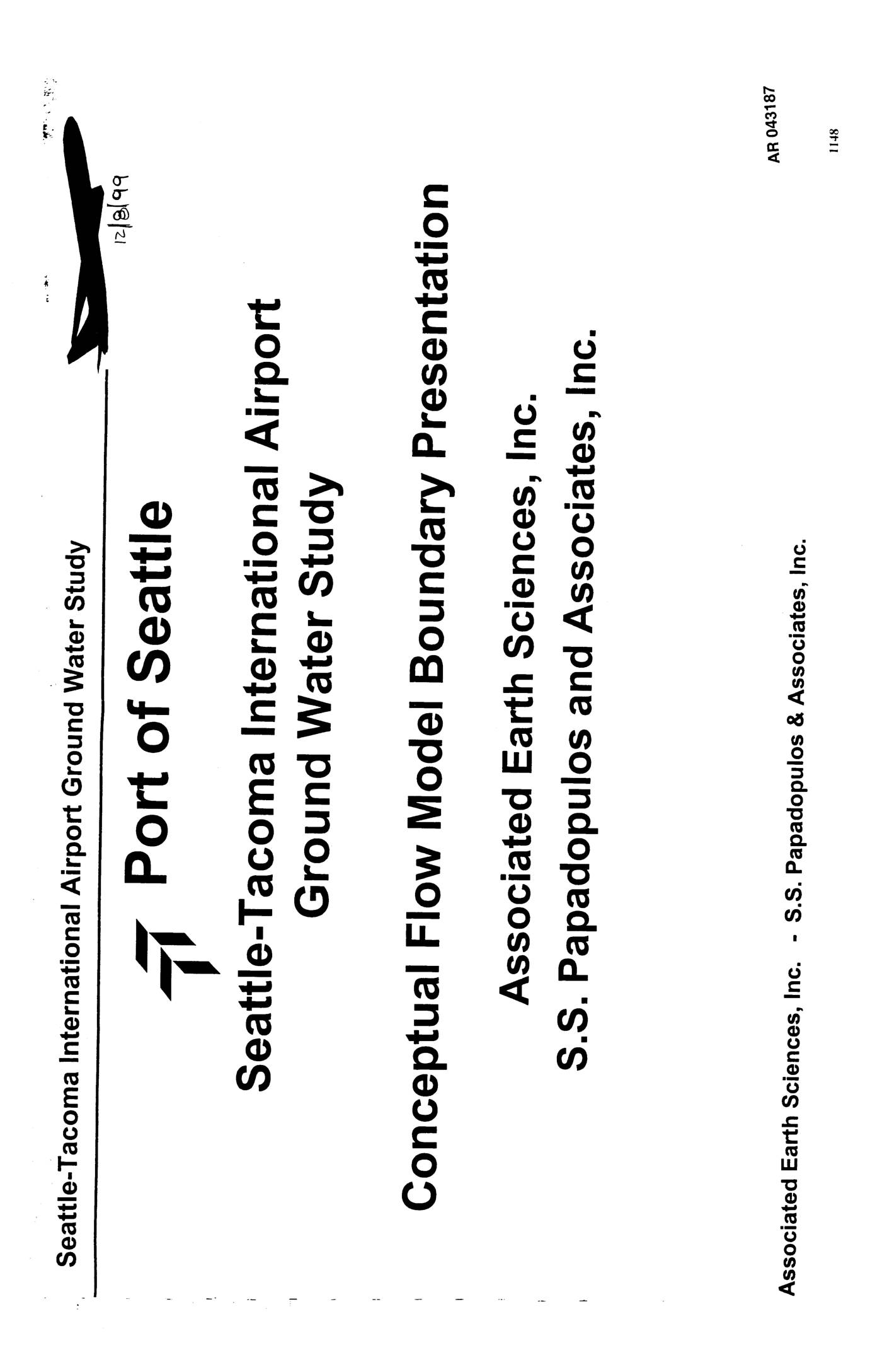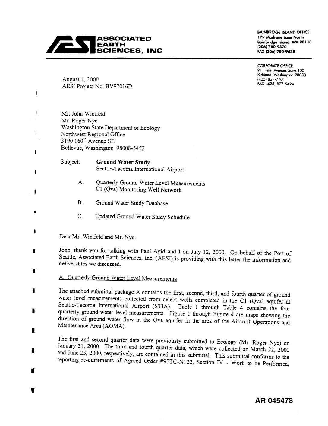 John, thank you for talking with Paul Agid and I on July 12, 2000. On behalf of the Port of Seattle, Associated Earth Sciences, Inc. (AESI) is providing with this letter the information and deliverables we discussed. A. Quarterly Qround Water Level Measurements The attached submittal package A contains the first, second, third, and fourth quarter of ground water level measurements collected from select wells completed in the C1 (Qva) aquifer at Seattle-Tacoma International Airport (STIA). Table 1 through Table zl contains the four quarterly ground water level measurements. Figure 1 through Figure 4 are maps showing the direction of ground water flow in the Qva aquifer in the area of the Aircraft Operations and Maintenance Area (AOMA). The first and second quarter data were previously submitted to Ecology (Mr. Roger Nye) on January 31, 2000. The third and fourth quarter data, which were collected on March 22, 2000 and June 23, 2000, respectively, are contained in this submittal. This submittal conforms to the reporting re-quirements of Agreed Order #97TC-N122, Section IV - Work to be Performed, AR 045478 Mr. John Wieffeld Mr. Roger Nye AESI Project No. Br97016D August 1, 2000 Page 2 Item 2. The reporting requirements under Item 2 can be considered complete based on the data attached to this letter. Quarterly or more frequent water level data were obtained from the following wells, the loca- tions of which are shown on the ground water flow direction maps (Figure 1 through Figure 4). J Well Well Owner… -