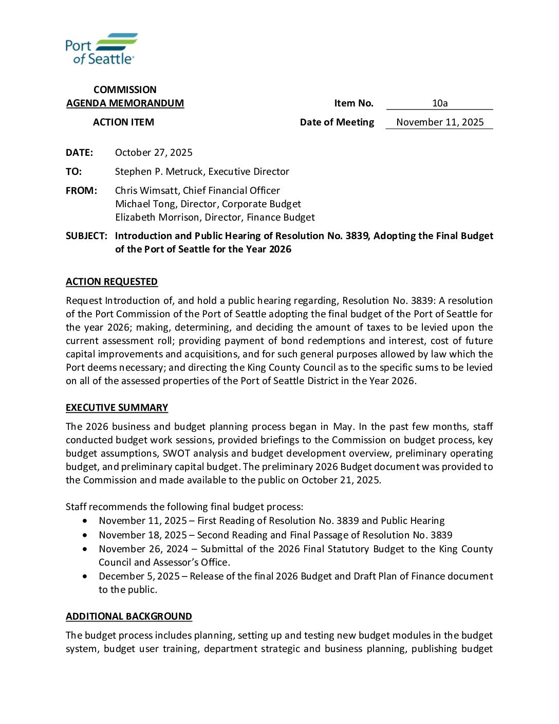-- Adoption of Resolution No. 3839, Final Budget of the Port of Seattle for 2026 -- Adoption of Resolution No. 3840, specifying the dollar and percentage change in the Regular Property Levy for an increase on the levy from $88,389,944 to $90,180,054. -- Airport Dining and Retail Update ($440,000,000) -- Police Dept. Update (extremely informative presentation) -