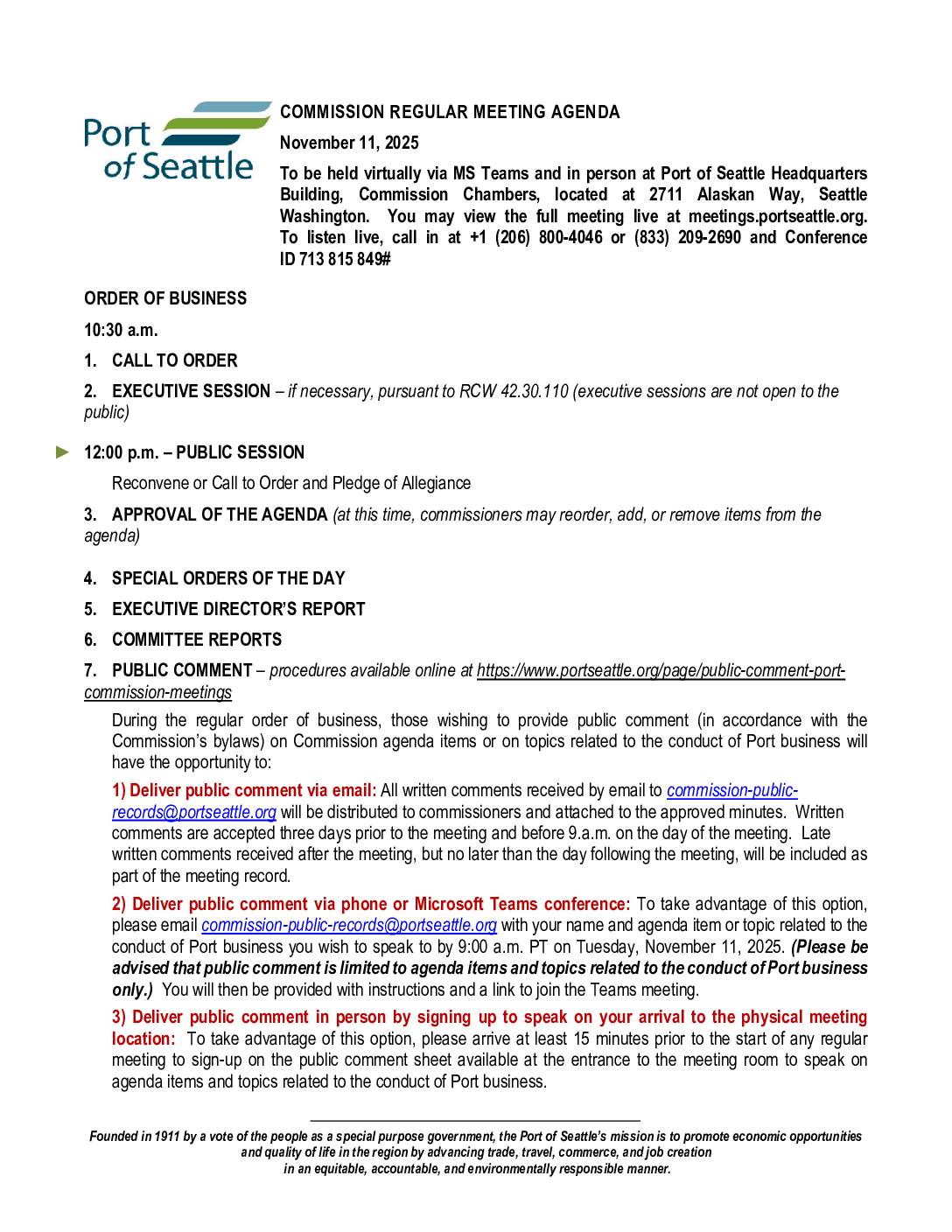 ORDER OF BUSINESS 10:30 a.m. 1. CALL TO ORDER 2. EXECUTIVE SESSION – if necessary, pursuant to RCW 42.30.110 (executive sessions are not open to the public) 12:00 p.m. – PUBLIC SESSION Reconvene or Call to Order and Pledge of Allegiance 3. APPROVAL OF THE AGENDA 4. SPECIAL ORDERS OF THE DAY 5. EXECUTIVE DIRECTOR’S -