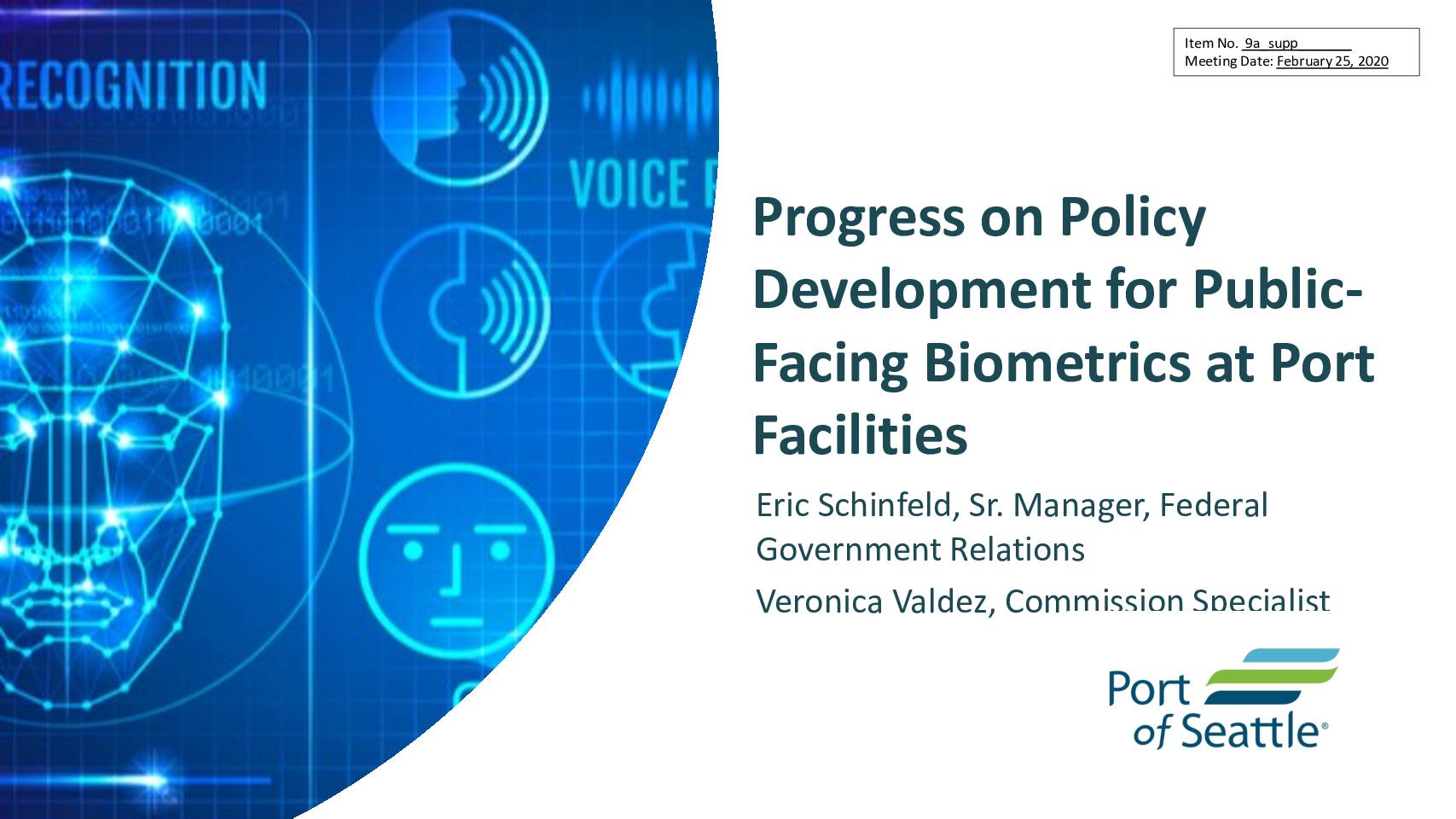 Progress on Policy Development for Public- Facing Biometrics at Port Facilities Eric Schinfeld, Sr. Manager, Federal Government Relations Veronica Valdez, Commission Specialist -