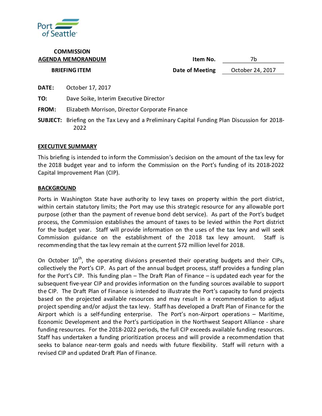 Port of Seattle Regular Meeting, October 24, 2017 – Item 7b Supplement