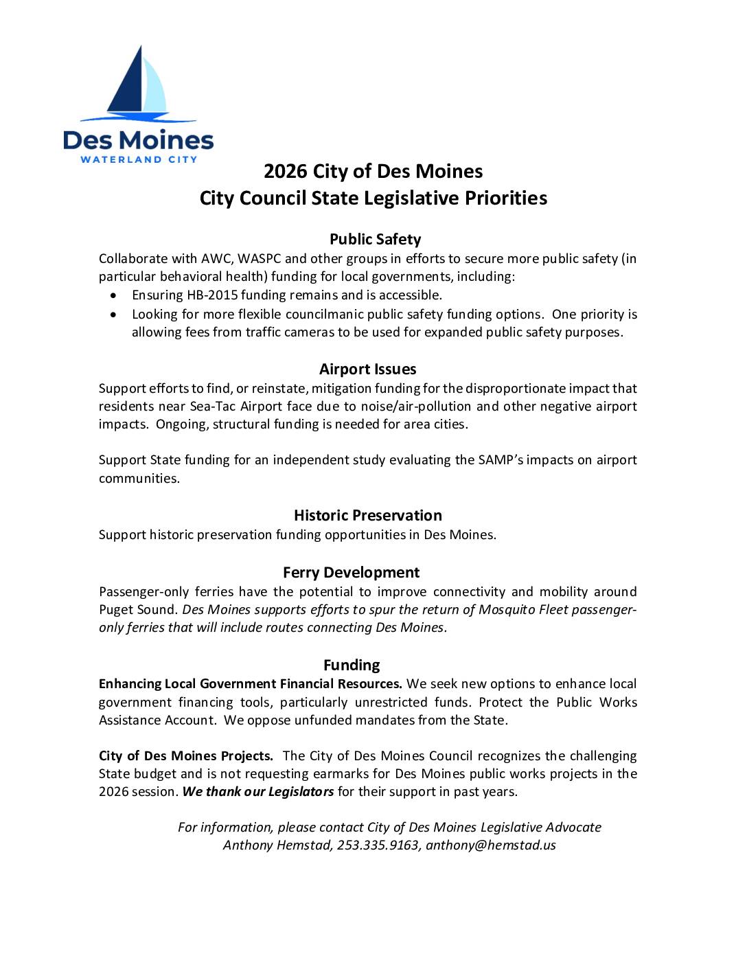 Des Moines City Council’s legislative priorities for the 2026 state legislative session, covering public safety funding, airport impact mitigation, historic preservation, ferry development, and local government financial resources. The city is not requesting earmarks for public works projects due to the challenging state budget. -