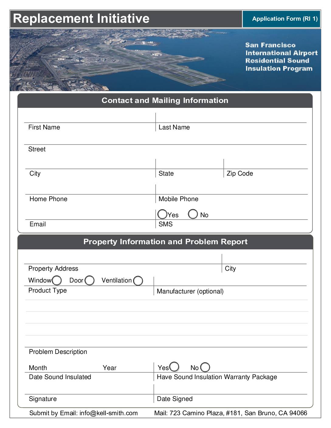 Date Sound Insulated Have Sound Insulation Warranty Package Signature Date Signed Property Information and Problem Report Submit by Email: info@kell-smith.com Mail: 723 Camino Plaza, #181, San Bruno, CA 94066 Replacement Noise Insulation Initiative The San Francisco International Airport’s (SFO) Replacement Noise Insulation Initiative is intended to provide acoustical improvements to qualifying residential properties that meet certain eligibility requirements. These improvements are offered at no cost to eligible property owners. This initiative provides repair or replacement of eligible acoustical improvements to residential properties that were insulated in previous phases of the SFO Noise Insulation Program (NIP), where the improvements have failed. To be considered, the property must be located inside a specific “noise boundary” corresponding to the area where the average daily aircraft noise level is equal to or greater than 65 decibels. This contour is designated as the 65-dB CNEL noise contour in the SFO Noise Exposure Map, as accepted by the Federal Aviation Administration (FAA). Future phases of this Initiative may consider properties outside this noise contour on a case by case basis, depending on the dwelling’s proximity to the 65-dB contour and availability of funds. Replacement Noise Insulation: This initiative is for residential properties that received acoustical improvements in prior phases of SFO’s NIP but the improvements have failed. Improvements may be eligible for repair or replacement subject to the following criteria: Only acoustical improvements originally installed as part of SFO’s NIP are potentially eligible for repair or replacement under this initiative. Preliminary eligibility must be… -