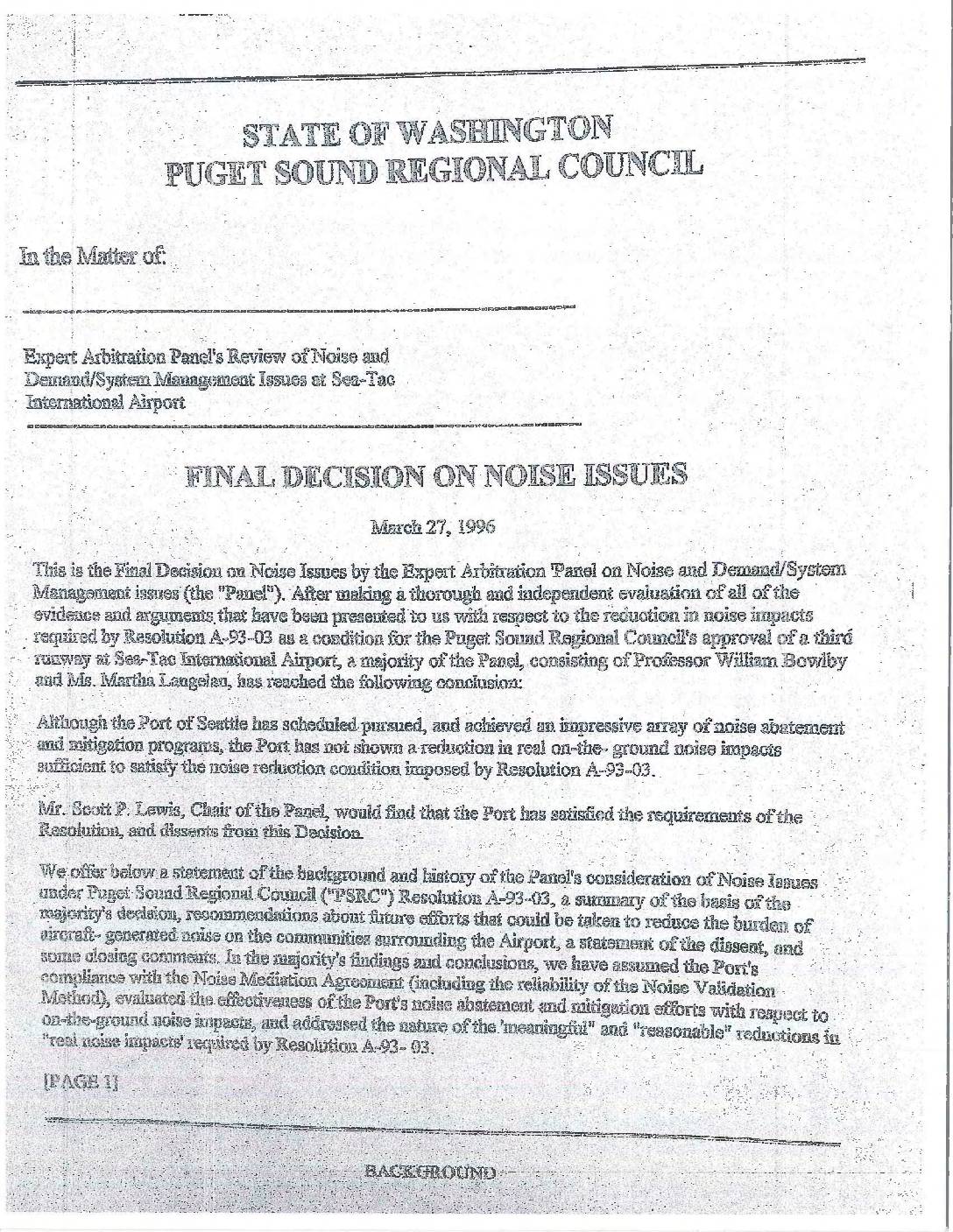 PSRC Expert Arbitration Panel Final Decision On Noise Issues March 27 1996