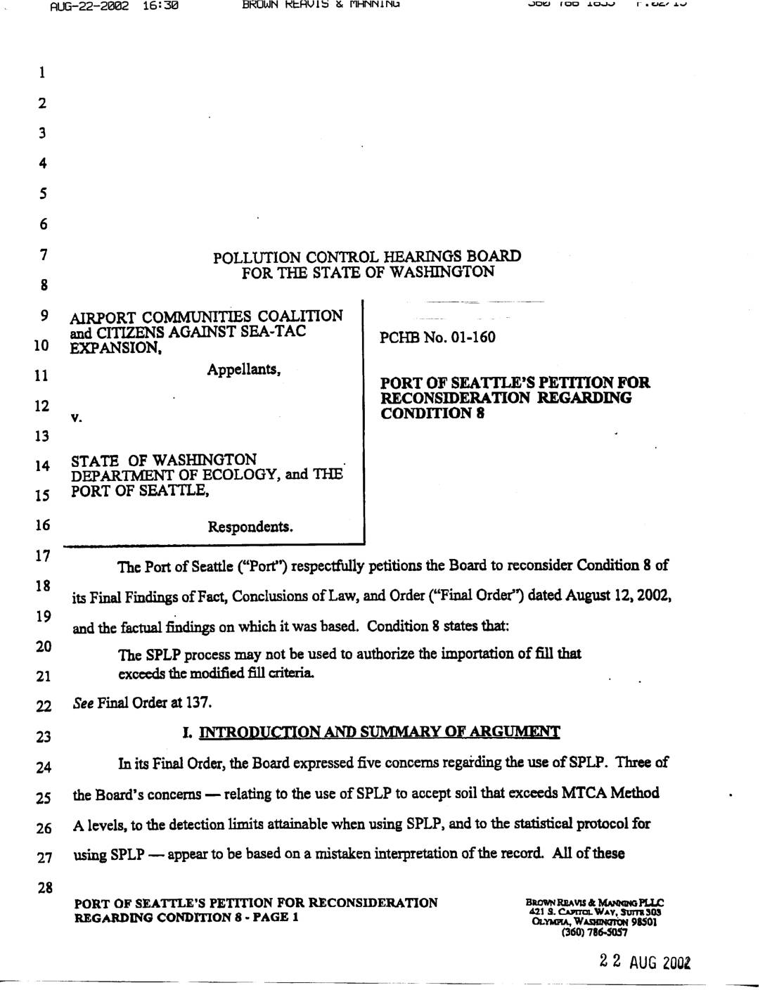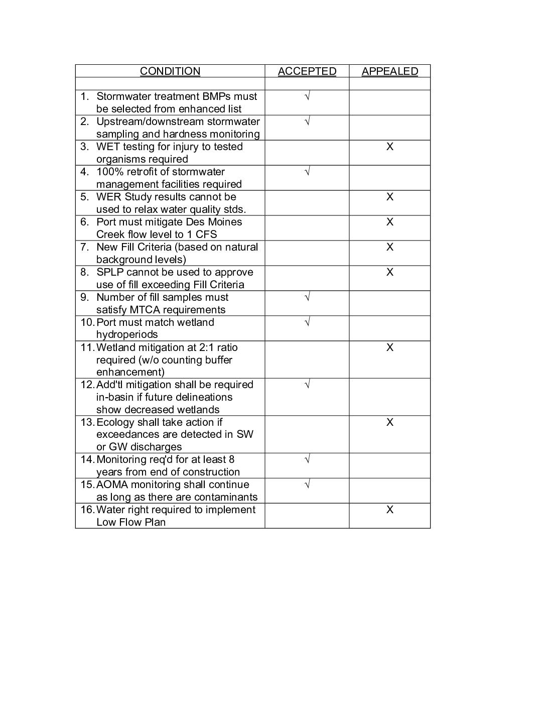 3. WET testing for injury to tested organisms required X 4. 100% retrofit of stormwater management facilities required √ 5. WER Study results cannot be used to relax water quality stds. X 6. Port must mitigate Des Moines Creek flow level to 1 CFS X 7. New Fill Criteria (based on natural background levels) X 8. SPLP cannot be used to approve use of fill exceeding Fill Criteria X 9. Number of fill samples must satisfy MTCA requirements √ 10. Port must match wetland hydroperiods √ 11. Wetland mitigation at 2:1 ratio required (w/o counting buffer enhancement) X 12. Add'tl mitigation shall be required in-basin if future delineations show decreased wetlands √ 13. Ecology shall take action if exceedances are detected in SW or GW discharges X 14. Monitoring req'd for at least 8 years from end of construction √ 15. AOMA monitoring shall continue as long as there are contaminants √ 16. Water right required to implement Low Flow Plan X
