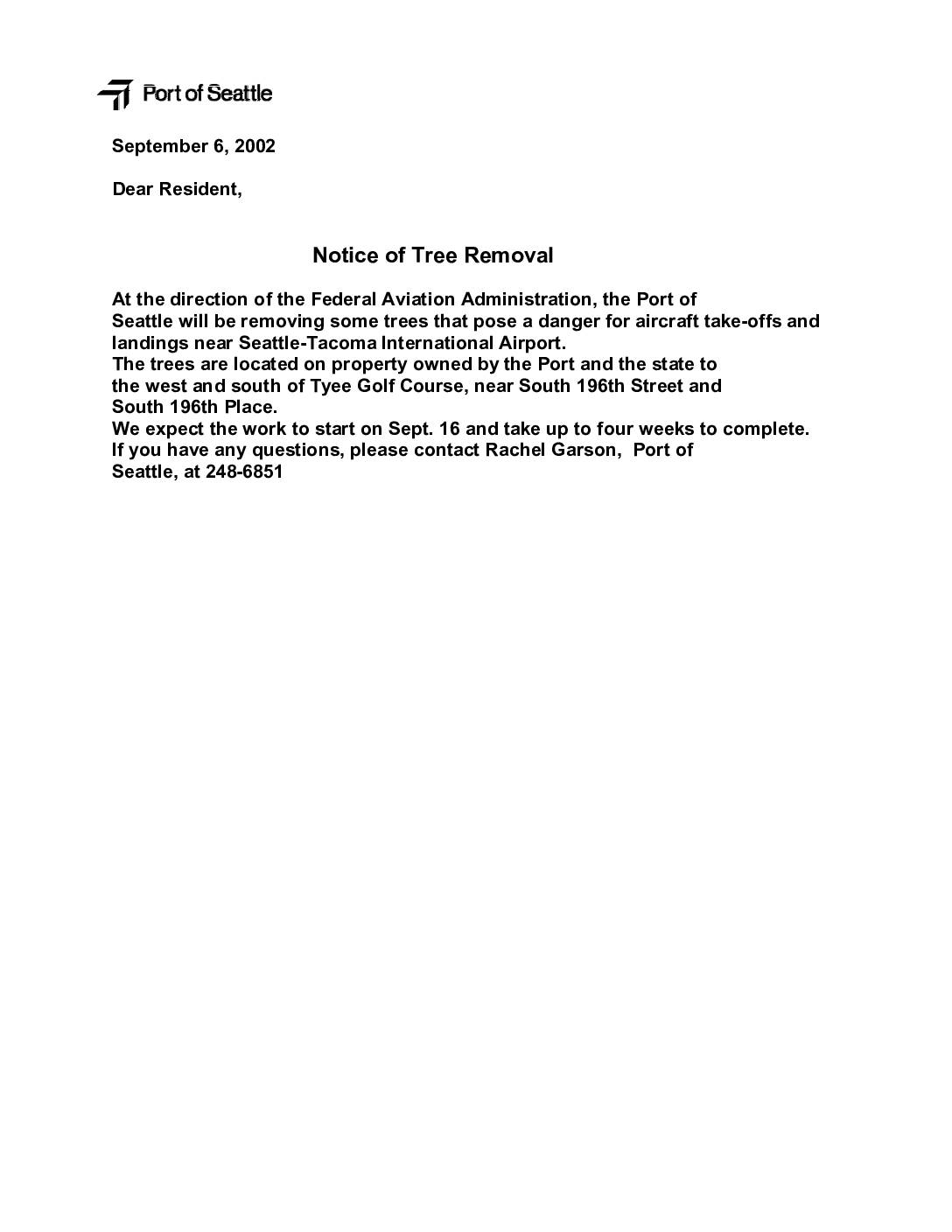 At the direction of the Federal Aviation Administration, the Port of Seattle will be removing some trees that pose a danger for aircraft take-offs and landings near Seattle-Tacoma International Airport. The trees are located on property owned by the Port and the state to the west and south of Tyee Golf Course, near South 196th Street and South 196th Place. We expect the work to start on Sept. 16 and take up to four weeks to complete. If you have any questions, please contact Rachel Garson, Port of Seattle, at 248-6851 September 6, 2002 Notice of Tree Removal -
