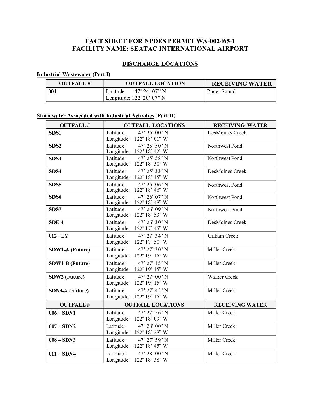 Stormwater Associated with Industrial Activities (Part II) OUTFALL # OUTFALL LOCATIONS RECEIVING WATER SDS1 Latitude: 47˚ 26’ 00” N Longitude: 122˚ 18’ 01” W DesMoines Creek SDS2 Latitude: 47˚ 25’ 50” N Longitude: 122˚ 18’ 42” W Northwest Pond SDS3 Latitude: 47˚ 25’ 58” N Longitude: 122˚ 18’ 30” W Northwest Pond SDS4 Latitude: 47˚ 25’ 33” N Longitude: 122˚ 18’ 15” W DesMoines Creek SDS5 Latitude: 47˚ 26’ 06” N Longitude: 122˚ 18’ 46” W Northwest Pond SDS6 Latitude: 47˚ 26’ 07” N Longitude: 122˚ 18’ 48” W Northwest Pond SDS7 Latitude: 47˚ 26’ 09” N Longitude: 122˚ 18’ 53” W Northwest Pond SDE 4 Latitude: 47˚ 26’ 30” N Longitude: 122˚ 17’ 45” W DesMoines Creek 012 –EY Latitude: 47˚ 27’ 34” N Longitude: 122˚ 17’ 50” W Gilliam Creek SDW1-A (Future) Latitude: 47˚ 27’ 30” N Longitude: 122˚ 19’ 15” W Miller Creek SDW1-B (Future) Latitude: 47˚ 27’ 15” N Longitude: 122˚ 19’ 15” W Miller Creek SDW2 (Future) Latitude: 47˚ 27’ 00” N Longitude: 122˚ 19’ 15” W Walker Creek SDN3-A (Future) Latitude: 47˚ 27’ 45” N Longitude: 122˚ 19’ 15” W Miller Creek OUTFALL # OUTFALL LOCATIONS RECEIVING WATER 006 – SDN1 Latitude: 47˚ 27’ 56” N Longitude: 122˚ 18’ 09” W Miller Creek 007 – SDN2 Latitude: 47˚ 28’ 00” N Longitude: 122˚ 18’ 28” W Miller Creek 008 – SDN3 Latitude: 47˚ 27’ 59” N Longitude: 122˚ 18’ 45” W Miller Creek 011 – SDN4 Latitude: 47˚ 28’ 00” N Longitude: 122˚ 18’… -