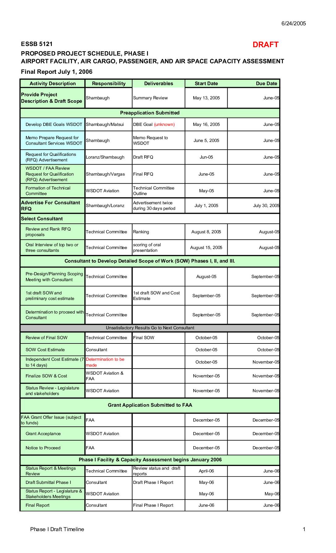 Activity Description Responsibility Deliverables Start Date Due Date Provide Project Description & Draft Scope Shambaugh Summary Review May 13, 2005 June-05 Develop DBE Goals WSDOT Shambaugh/Matsui DBE Goal (unknown) May 16, 2005 June-05 Memo Prepare Request for Consultant Services WSDOT Shambaugh Memo Request to WSDOT June 5, 2005 June-05 Request for Qualifications (RFQ) Advertisement Loranz/Shambaugh Draft RFQ Jun-05 June-05 WSDOT / FAA Review Request for Qualification (RFQ) Advertisement Shambaugh/Vargas Final RFQ June-05 June-05 Formation of Technical Committee WSDOT Aviation Technical Committee Outline May-05 June-05 Advertise For Consultant RFQ Shambaugh/Loranz Advertisement twice during 30 days period July 1, 2005 July 30, 2005 Select Consultant Review and Rank RFQ proposals Technical Committee Ranking August 8, 2005 August-05 Oral Interview of top two or three consultants Technical Committee scoring of oral presentation August 15, 2005 August-05 Pre-Design/Planning Scoping Meeting with Consultant Technical Committee August-05 September-05 1st draft SOW and preliminary cost estimate Technical Committee 1st draft SOW and Cost Estimate September-05 September-05 Determination to proceed with Consultant Technical Committee September-05 September-05 Review of Final SOW Technical Committee Final SOW October-05 October-05 SOW Cost Estimate Consultant October-05 October-05 Independent Cost Estimate (7 to 14 days) Determination to be made October-05 November-05 Finalize SOW & Cost WSDOT Aviation & FAA November-05 November-05 Status Review - Legislature and stakeholders WSDOT Aviation November-05 November-05 FAA Grant Offer Issue (subject to funds) FAA December-05 December-05 Grant Acceptance WSDOT Aviation December-05 December-05 Notice to Proceed FAA December-05 December-05 Status Report & Meetings Review Technical Committee Review status and draft… -
