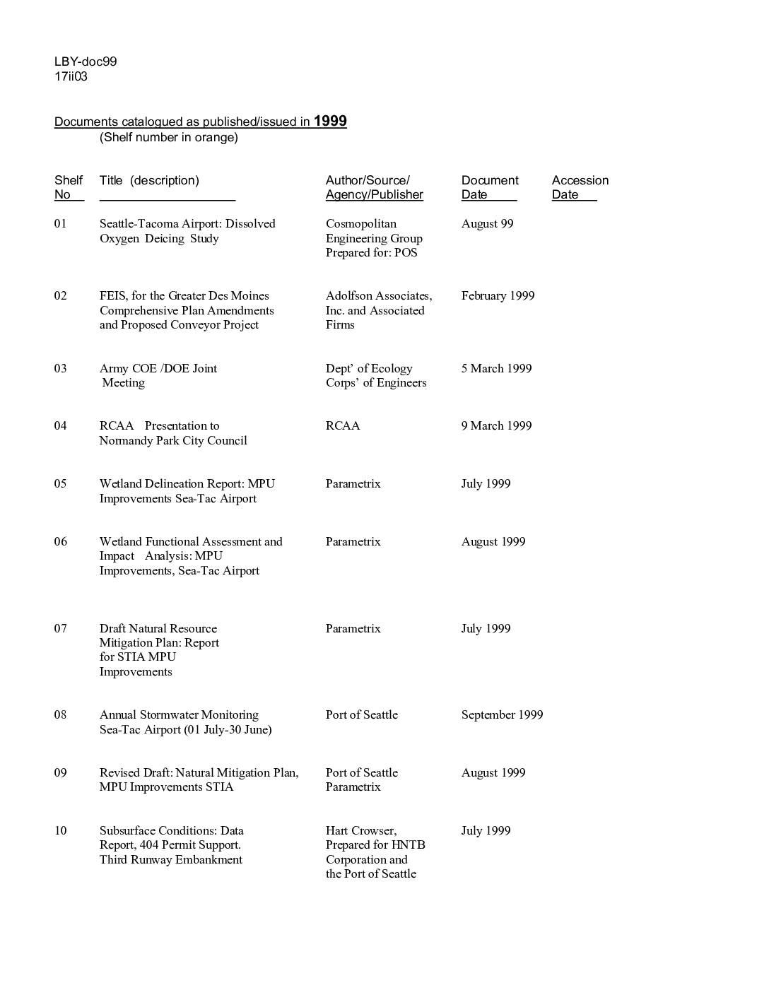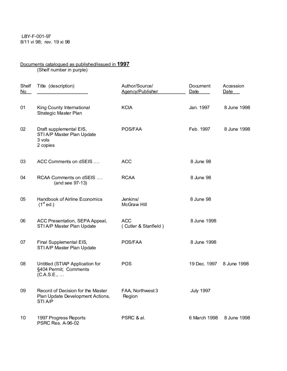 King County International KCIA Jan. 1997 8 June 1998 Strategic Master Plan Draft supplemental EIS, POS/FAA Feb. 1997 8 June 1998 STI A/P Master Plan Update vols copies ACC Comments on dSEIS …. ACC 8 June 98 RCAA Comments on dSEIS …. RCAA 8 June 98 (and see 97-13) Handbook of Airline Economics Jenkins/ 8 June 98 (1st ed.) McGraw Hill ACC Presentation, SEPA Appeal, ACC 8 June 1998 STI A/P Master Plan Update ( Cutler & Stanfield ) Final Supplemental EIS, POS/FAA 8 June 1998 STI A/P Master Plan Update Untitled (STIAP Application for POS 19 Dec. 1997 8 June 1998 §404 Permit; Comments (C.A.S.E., … Record of Decision for the Master FAA, Northwest 3 July 1997 Plan Update Development Actions, Region STI A/P 1997 Progress Reports PSRC & al. 6 March 1998 8 June 1998 PSRC Res. A-96-02 -