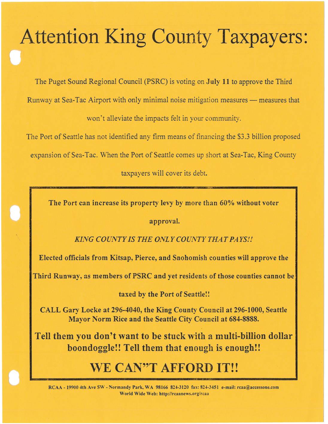 The Puget Sound Regional Council (PSRC) is voting on July 11 to approve the Third Runway at Sea-Tac Airport with only minimal noise mitigation measures- measures that won't alleviate the impacts felt in your community. The Port of Seattle has not identified any firm means of financing the $3.3 billion proposed expansion of Sea-Tac. When the Port of Seattle comes up short at Sea-Tac, King County taxpayers will cover its debt. The Port can increase its property levy by more than 60°/o without voter approval. KING COUNTY IS THE ONLY COUNTY THAT PAYS!! Elected officials from Kitsap, Pierce, and Snohomish counties will approve the Third Runway, as members of PSRC and yet residents of those counties cannot be taxed by the Port of Seattle!! CALL Gary Locke at 296-4040, the King County Council at 296-1000, Seattle Mayor Norm Rice and the Seattle City Council at 684-8888. Tell them you don't want to be stuck with a multi-billion dollar boondoggle!! Tell them that enough is enough!! WE CAN"T AFFORD IT!! RCAA -19900 4th Ave SW- Normandy Park, WA 98166 824-3120 fax: 824-3451 e-mail: rcaa@accessone.com World Wide Web: http://rcaanews.org/rcaa -