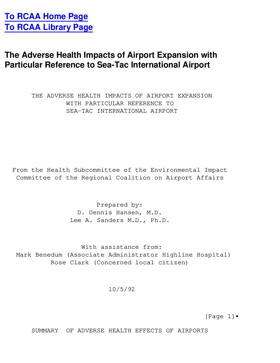 The Adverse Health Impacts of Airport Expansion with Particular Reference to Sea-Tac International Airport THE ADVERSE HEALTH IMPACTS OF AIRPORT EXPANSION WITH PARTICULAR REFERENCE TO SEA-TAC INTERNATIONAL AIRPORT From the Health Subcommittee of the Environmental Impact Committee of the Regional Coalition on Airport Affairs Prepared by: D. Dennis Hansen, M.D. Lee A. Sanders M.D., Ph.D. With assistance from: Mark Benedum (Associate Administrator Highline Hospital) Rose Clark (Concerned local citizen) 10/5/92 [Page 1]• SUMMARY OF ADVERSE HEALTH EFFECTS OF AIRPORTS http://www.rcaanews.org/ http://www.rcaanews.org/libr1.htm Fiction: Airport noise is a minor annoyance and people living near the airport should be "good sports" and learn to ignore it. Fact: Airport noise results in a significant increase in community use of tranquilizers and sleeping pills. Airport communities have an increased rate of alcoholism, and admissions to psychiatric hospitals. Airport-related noise can literally drive people mad.• /////////////////////////////////////////// Fiction: Communities near the airport offer affordable housing and would be suitable for young families. Fact: Infants born to mothers living under the flight path have lower birth weights and higher likelihood of prematurity. There is some experimental evidence to suggest that serious birth defects are more likely when the mother is exposed to high noise levels during pregnancy. Airport communities are unsafe for pregnant women and their children. /////////////////////////////////////////// Fiction: Although it is annoying, airport noise will not affect your physical health. Fact: Excessive noise has been positively associated with the development of hypertension, high cholesterol, and high blood sugar, all of which place people at increased risk of… -