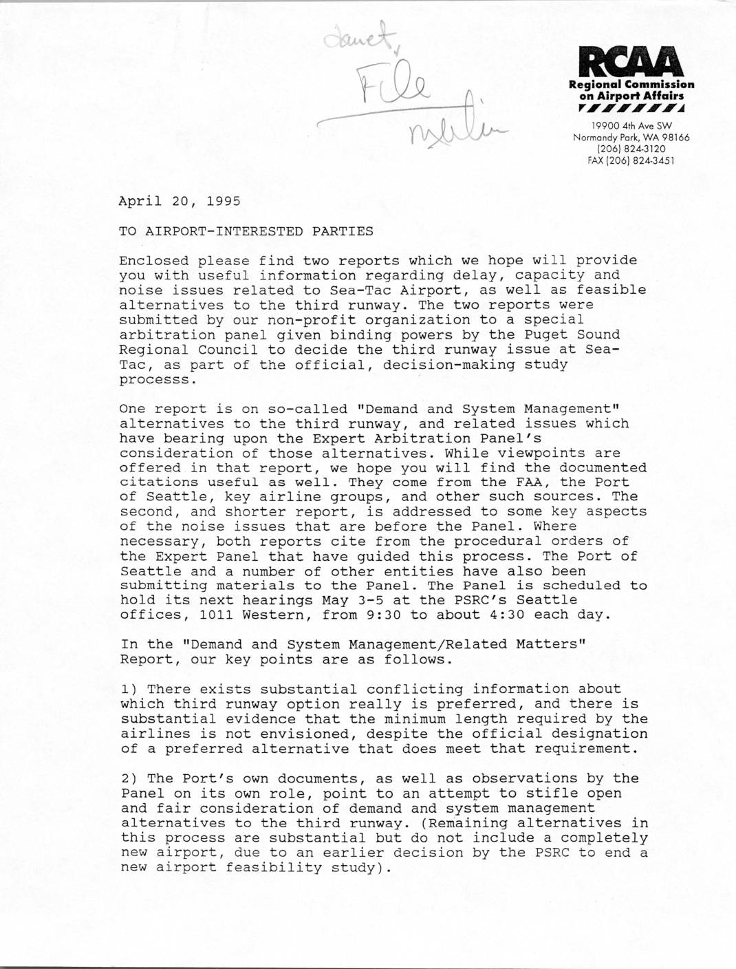 Enclosed please find two reports which we hope will provide you with useful information regarding delay , capacity and noise issues related to Sea-Tac Airport , as well as feasible alternatives to the third runway . The two reports were submitted by our non'-profit organization to a special arbitration panel given binding powers by the Puget Sound Regional Council to decide the third runway issue at Sea- Tac , as part of the official, decision-making study processs One report is on so'-'called "Demand and System Management'1 alternatives to the third runway , and related issues which have bearing upon the Expert Arbitration Panel’s consideration of those alternatives . While viewpoints are offered in that report , we hope you will find the documented citations useful as well. They come from the FAA , the Port of Seattle , key airline groups , and other such sources . The second , and shorter report , is addressed to some key aspects of tEle noise issues that are before the Panel. Where necessary, both reports cite from the procedural orders of the Expert Panel that have guided this process . The Port of Seattle and a number of other entities have also been submitting materials to the Panel. The Panel is scheduled to hold its next hearings May 3-'5 at the PSRC’s Seattle offices , 1011 Western , from 9 : 30 to about 4 : 30 each day . In the ’IDemand and System Management/Related Matterst1 Report, our key points are… -