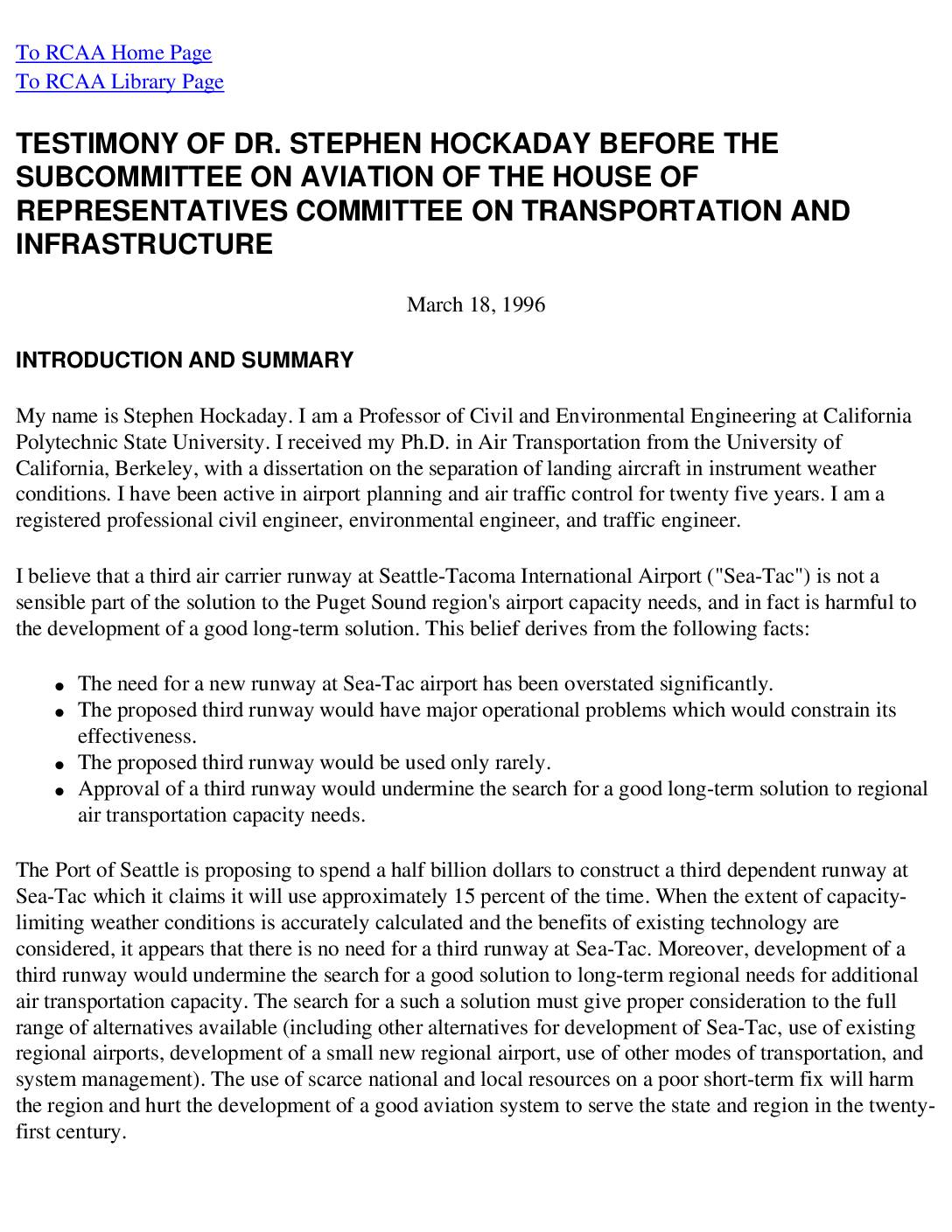 My name is Stephen Hockaday. I am a Professor of Civil and Environmental Engineering at California Polytechnic State University. I received my Ph.D. in Air Transportation from the University of California, Berkeley, with a dissertation on the separation of landing aircraft in instrument weather conditions. I have been active in airport planning and air traffic control for twenty five years. I am a registered professional civil engineer, environmental engineer, and traffic engineer. believe that a third air carrier runway at Seattle-Tacoma International Airport ("Sea-Tac") is not a sensible part of the solution to the Puget Sound region's airport capacity needs, and in fact is harmful to the development of a good long-term solution. This belief derives from the following facts: ● The need for a new runway at Sea-Tac airport has been overstated significantly. ● The proposed third runway would have major operational problems which would constrain its effectiveness. ● The proposed third runway would be used only rarely. ● Approval of a third runway would undermine the search for a good long-term solution to regional air transportation capacity needs. The Port of Seattle is proposing to spend a half billion dollars to construct a third dependent runway at Sea-Tac which it claims it will use approximately 15 percent of the time. When the extent of capacity- limiting weather conditions is accurately calculated and the benefits of existing technology are considered, it appears that there is no need for a third runway at Sea-Tac. Moreover, development of a third runway… -