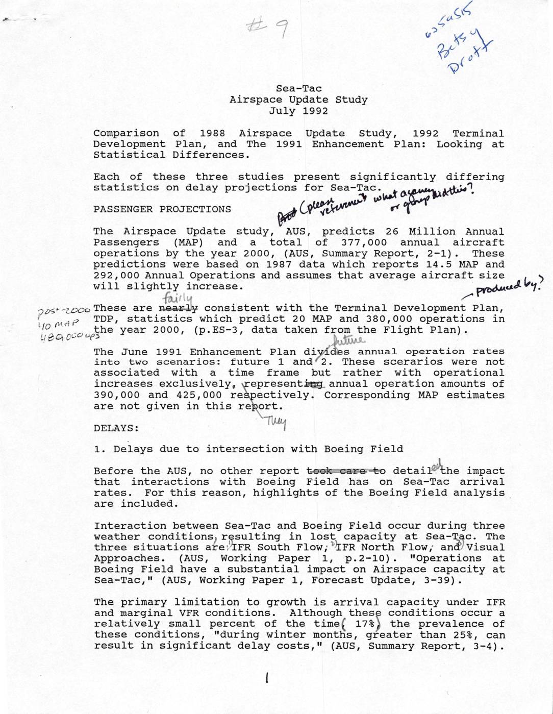 Comparison of 1988 Airspace Update Study , 1992 Terminal Development Plan, and The 1991 Enhancement Plan: Looking at Statistical Differences . Each of statistics these three studies on delay projectionsBIb a• aH present significantly differing cH;;#%"i'm“"' @ PASSENGER PROJECTIONS The Airspace Update study, AUS , predicts 26 Million Annual Passengers (MAP ) and a total of 377 , 00 0 annual aircraft operations by the year 2000 , ( AUS, Summary Report, 2""'1) . These predictions were based on 1987 data which reports 14.5 MAP and 292 , 000 Annual Operations and assumes that average aircraft size will slightly increase. aS a ') ,.,<,F -uno These are consistent with the Terminal Development Plan, {'- „. _, p TDP, statistics which predict 20 MAP and 380 , 000 operations in Lj%=';Coopthe year 2000, (p.ES--3, data taken fXOF_lathe Flight Plan) . :i -/ p=dJ bY? The June 1991 Enhancement Plan div':4des annual operation rates into two scenarios : future 1 and /2 . These scerarios were not associated with a time frame but rather with operational increases exclusively, v’'epresentIh% annual operation amounts of 390 , 000 and 425 , 000 rekpectively. Corresponding MAP estimates are not given in this reXortI. DELAYS : 1. Delays due to intersection with Boeing Field Before the AUS, no other report b#4D detailaq:he impact that interactions with Boeing Field has on Sea"-Tac arrival rates . For this reason, highlights of the Boeing Field analysis are included. Interaction between Sea'-Tac and Boeing Field occur during three weather conditions/… -