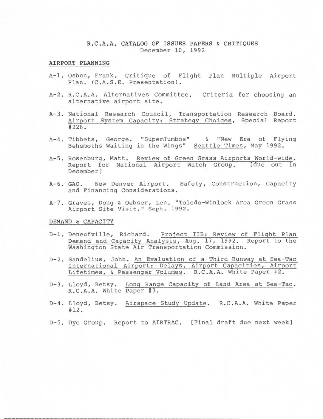 A-1. Osbun , Frank . Critique of Flight Plan , ((_' , A. S , E , Presentation ) , Plan Multiple Airport A-2 . R.C . A. A. Alternatives Committee . alternative airport site . Criteria for choosing an A--3 . National Research Council, Transportation Research Board . Airport System Capacity : Strategy Choices , Special Report #226 A–4 , Tibbets , George . "SuperJumbos " & "New Era of Flying Behemoths Waiting in the Wings" Seattle Times , May 1992 . Report for National Airport Watch Group. [due out in December 1 A–6 , GAO, New Denver Airport , Safety , Construction , Capacity and Financing Considerations . A–7 , Graves , Doug & Oebser , Len , "Toledo–Winlock Area Green Grass Airport Site Visit , 11 Sept , 1992 , DEMAND & CAPACITY D--1 Demand and Capacity Analysis , Aug . 17 , 1992 . Report to the Washington State Air Transportation Commission . D-2 Sandelius , John . An Evaluation of a Third Runway at Sea–Tac International Airport : Delays , Airport Capacities , Airport Lifetimes , & Passenger Volumes . R. C . A, Ao White Paper #2 + D--3 D-4 D-5 R, C . A. A. White Paper # 3 , Lloyd , Betsy . #12 . Airspace Study Update . R. C . A. A. White Paper Dye Group. Report to AIRTR AC . [Final draft due next week ] ECONOMICS E-1 Zerbe , Richard & Associates . Deficiencies of Existing Analyses of…