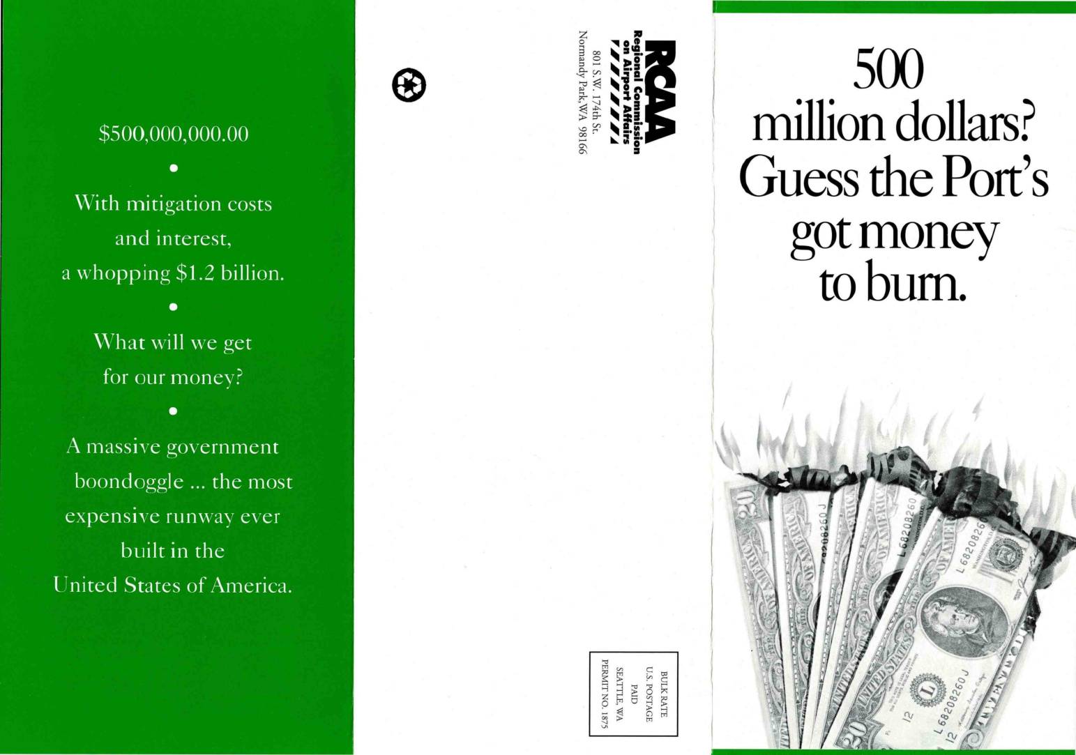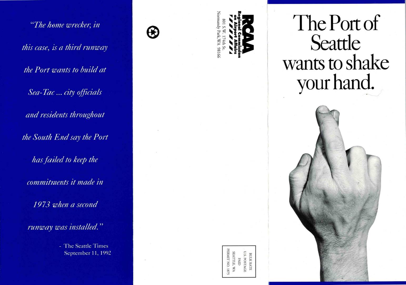• As the Seattle Times reports, when the second Sea-Tac runway was built in 1973, “The Port promised to buy or insu- late the noisiest homes over the next two decades” • The Highlinc Times-Federal Way News documented how the Port has utter- ly failed to live up to its 1973 mitigation promises: “From 1985 to 1991, the average rate of insulation was 80 homes per year. At that rate, it would have taken 125 years to insulate the 10,000 homes within the noise boundaries” • Now, the Port of Seattle wants to spend $500 million to build a new third runway at Sea-Tac – with interest costs, the total price tag could come to a whop- ping $1.2 billion • “But while air traffic has increased dramatically, only 700 of the 10,000 homes in the noise-impacted area have been insulated,” the Times said. “The first home was not insulated until 1986” • However, the Port has yet to meet obligations for the second runway built at Sea-Tac 20 years ago • “Since 1988 the Port has recognized an obligation to insulate public buildings within the noise remedy program area,” the Highline Times-Federal Way News reported, “yet the Port has never insulated any public buildings” • if the Port wouldn’t pay for the mid- gation they promised in 1973, how can we trust the promises they make today?• The Times likened the cities surrounding Sea-Tac to “a wronged spouse who ain’t gonna take it any more ... lashing out at… -