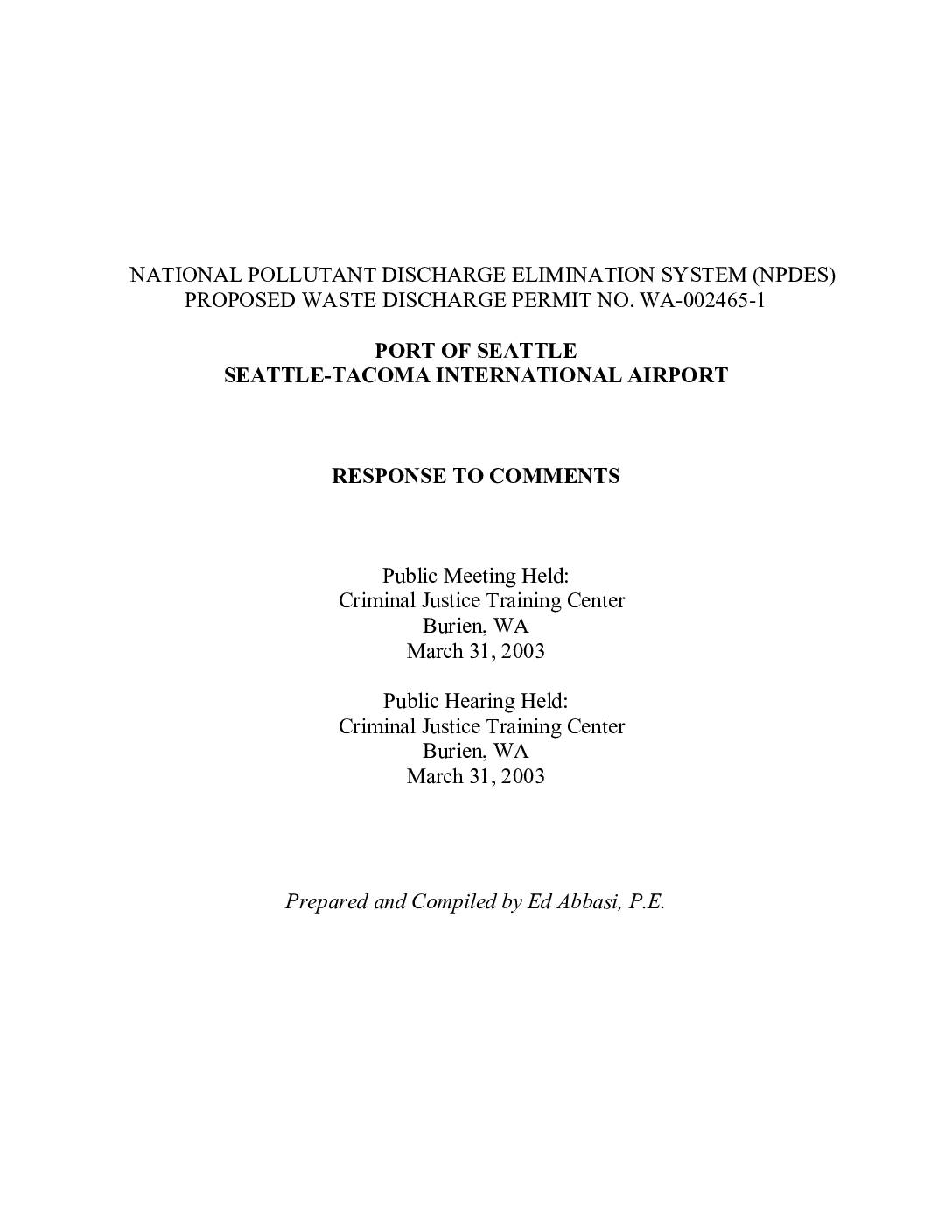 Prepared and Compiled by Ed Abbasi, P.E. RESPONSIVENESS SUMMARY FOR NPDES PERMIT WA-002465-1 Page 2 of 32 TABLE OF CONTENTS Page # Introduction………………………………………………………..…………………………. 3 Organization of the Responsiveness Summary……………………………………………….. 3 ACRONYMS ………………………………………………………........................................ 4 Response to Port Of Seattle…………………………………………………………………… 5 Response to RCAA……………………………………………………………………………. 12 Response to Smith & Lowney ………………………………………………………............... 15 Response to Senator Ms. Karen Keiser – 33rd Legislative District……………………………. 23 Response to State Representative Mr. Dave Upthegrove, Assistant Majority Whip – 33rd District……………………………………………………………………. 24 Response to Individual Comments: Ms. Pat Pompayo ……………………………………………………………………… 25 Mr. Stewart Weiss ……………………………………………….……………………. 25 Ms. Audrey Richter……………………………………………..………....................... 25 Mr. Carl Nealy.……………………………………………..………………………….. 26 Mr. John Merz.………………………………………………………………………… 26 Mr. Mike Anderson………………………………………………..……...................... 26 Mr. Greg Wingard………………………………………………….………………….. 26 Mr. Stuart Creighton……………………………………………………....................... 27 Mr. Jim Bartlemay………………………………………………………...................... 28 Mr. Greg Pole……………..……………………………………………………........... 28 Mr. David Wilson….....…………………………………………………...................... 29 Mr. Larry Corval …………………………………………………….………………… 29 Ms. Becky Stanley………………………………………………………...................... 29 Ms. Maggie Stannard……………………………………………………..................... 29 Mr. Frank Jovanovich………………………………………………..………………… 30 Ms. Arlene Brown…………………………………………………………………….. 30 Mr. David Athern……………………….……………………………………............. 30 Mr. Brett Fish.…………….……………………………………………………........... 30 Mr. Dan Caldwell……………………………………………………………………… 31 Mr. William C. Hall…………………………………………………………………… 31 Mr. Paul Henntides.…………………………………………………………………… 31 Mr. George Hadley……………………………………………………………………. 31 Mr. John McCaslin.…………………………………………………………………… 31 Mr. John Matthews……………………………………………………......................... 31 Mr. Stan Scarvie…………………………………………………….………………… 32 Ms. Gwen K. Schmaltz……………………………………………………………….. 32 Mr. Steven Friederich…………………………………………………………………. 32 Ms. Bonnie Miller……………………………………………………………………… 32 RESPONSIVENESS SUMMARY FOR NPDES PERMIT WA-002465-1 Page 3 of 32 INTRODUCTION The Department of Ecology has issued National Pollutant Discharge Elimination System (NPDES) Permit No. WA-002465-1 to the Port of Seattle for discharge of treated industrial wastewater associated with airport industrial activities and general stormwater runoff, and construction runoffs from Seattle-Tacoma International Airport (SEATAC… -