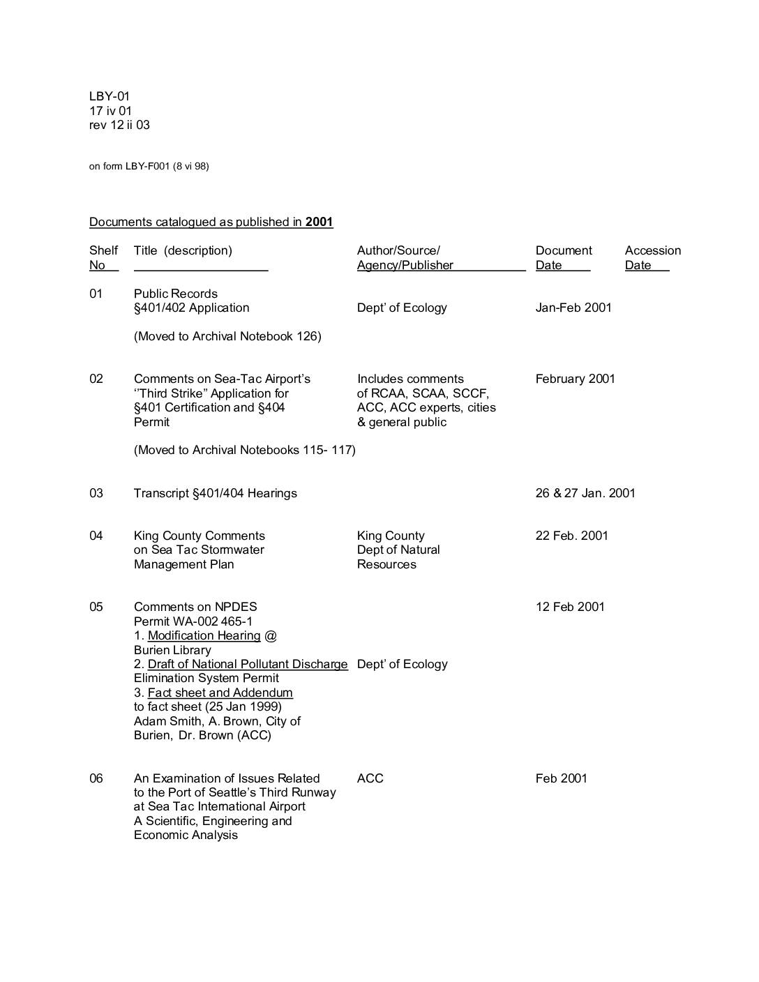 §401/402 Application Dept’ of Ecology Jan-Feb 2001 (Moved to Archival Notebook 126) Comments on Sea-Tac Airport’s Includes comments February 2001 ‘’Third Strike” Application for of RCAA, SCAA, SCCF, §401 Certification and §404 ACC, ACC experts, cities Permit & general public (Moved to Archival Notebooks 115- 117) Transcript §401/404 Hearings 26 & 27 Jan. 2001 King County Comments King County 22 Feb. 2001 on Sea Tac Stormwater Dept of Natural Management Plan Resources Comments on NPDES 12 Feb 2001 Permit WA-002 465-1 1. Modification Hearing @ Burien Library 2. Draft of National Pollutant Discharge Dept’ of Ecology Elimination System Permit 3. Fact sheet and Addendum to fact sheet (25 Jan 1999) Adam Smith, A. Brown, City of Burien, Dr. Brown (ACC) An Examination of Issues Related ACC Feb 2001 to the Port of Seattle’s Third Runway at Sea Tac International Airport A Scientific, Engineering and Economic Analysis -