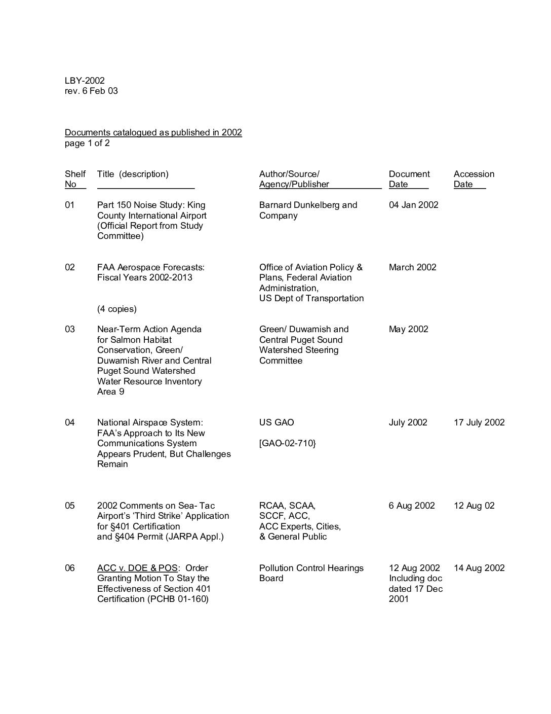 Part 150 Noise Study: King Barnard Dunkelberg and 04 Jan 2002 County International Airport Company (Official Report from Study Committee) FAA Aerospace Forecasts: Office of Aviation Policy & March 2002 Fiscal Years 2002-2013 Plans, Federal Aviation Administration, US Dept of Transportation (4 copies) Near-Term Action Agenda Green/ Duwamish and May 2002 for Salmon Habitat Central Puget Sound Conservation, Green/ Watershed Steering Duwamish River and Central Committee Puget Sound Watershed Water Resource Inventory Area 9 National Airspace System: US GAO July 2002 17 July 2002 FAA’s Approach to Its New Communications System [GAO-02-710} Appears Prudent, But Challenges Remain 2002 Comments on Sea- Tac RCAA, SCAA, 6 Aug 2002 12 Aug 02 Airport’s ‘Third Strike’ Application SCCF, ACC, for §401 Certification ACC Experts, Cities, and §404 Permit (JARPA Appl.) & General Public ACC v. DOE & POS: Order Pollution Control Hearings 12 Aug 2002 14 Aug 2002 Granting Motion To Stay the Board Including doc Effectiveness of Section 401 dated 17 Dec Certification (PCHB 01-160) 2001 -