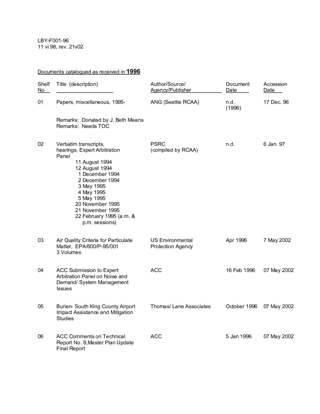Papers, miscellaneous, 1995- ANG (Seattle RCAA) n.d. 17 Dec. 96 (1996) Remarks: Donated by J. Beth Means Remarks: Needs TOC Verbatim transcripts, PSRC n.d. 6 Jan. 97 hearings, Expert Arbitration (compiled by RCAA) Panel August 1994 August 1994 December 1994 December 1994 May 1995 May 1995 May 1995 November 1995 November 1995 February 1995 (a.m. & p.m. sessions) Air Quality Criteria for Particulate US Environmental Apr 1996 7 May 2002 Matter, EPA/600/P-95/001 Protection Agency Volumes ACC Submission to Expert ACC 16 Feb 1996 07 May 2002 Arbitration Panel on Noise and Demand/ System Management Issues Burien- South King County Airport Thomas/ Lane Associates October 1996 07 May 2002 Impact Assistance and Mitigation Studies ACC Comments on Technical ACC 5 Jan 1996 07 May 2002 Report No. 8,Master Plan Update Final Report -